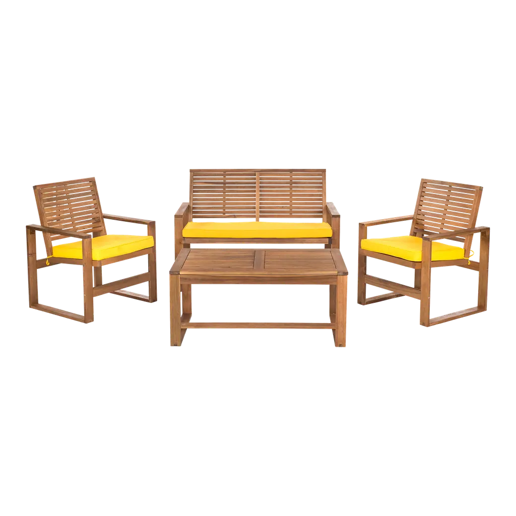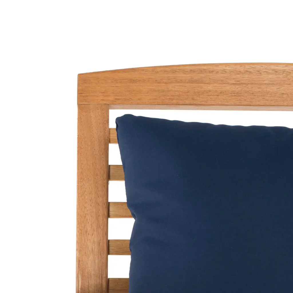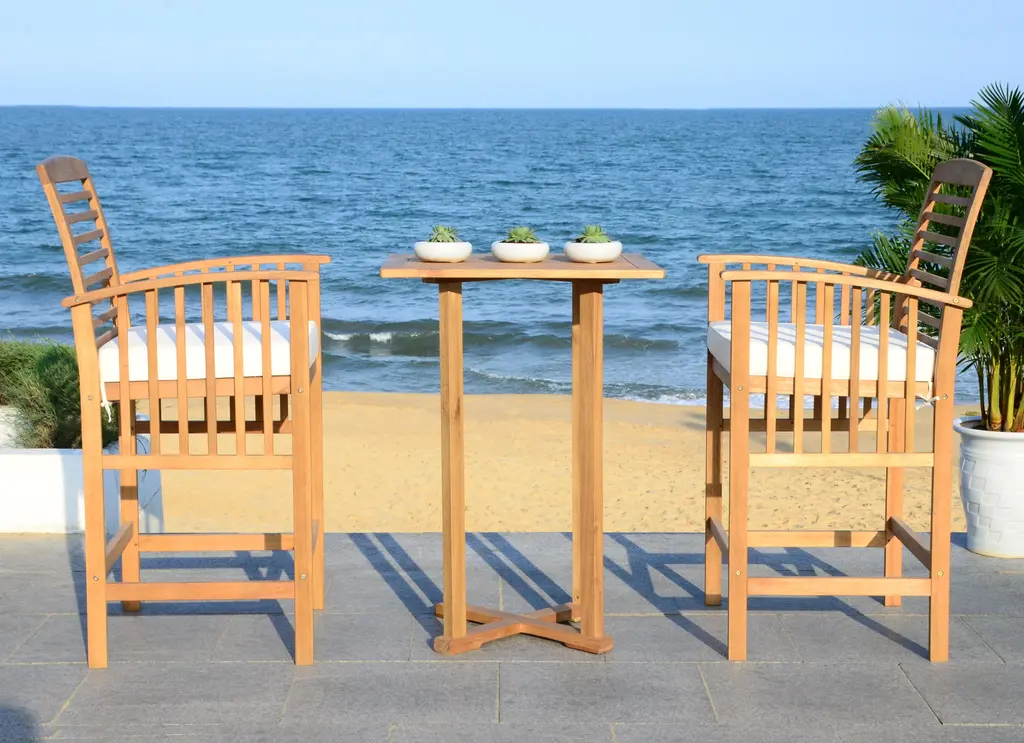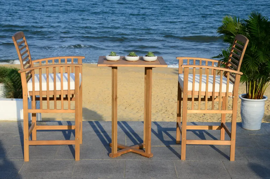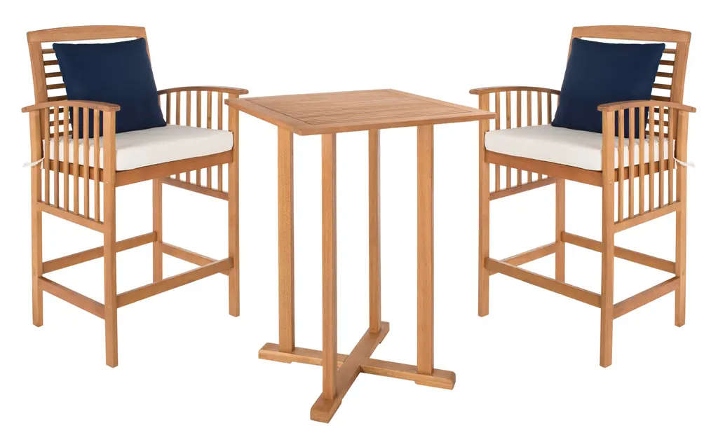 The hottest rooftop bar in Palm Springs inspired this 3-piece bar set. Crafted in a neutral natural, it's contemporary 39.8-inch table and sleek matching chairs with modern white upholstery lend instant bistro style to any outdoor terrace or entertaining area. Store outdoor furniture indoors or cover well when not in use. Remove wooden furniture from standing water. Dust regularly with small brush or vacuum. Spills should be taken care of immediately before they harden or stain with a slightly dampened sponge. Do not use bleach solutions. Some assembly required. Individual Dimensions: TABLE (1): 27.5 x 27.5 x 39.8 CHAIR (2): 25.1 x 26.4 x 50
