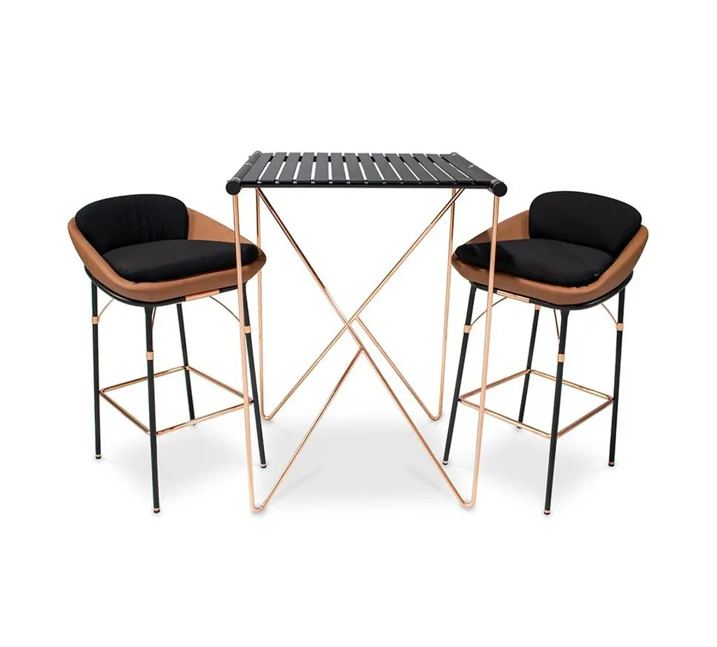 Noa Outdoor Bar TableDesigned with lightweight, weather-resistant stainless steel, the Noa bar table embodies durability and modern elegance. Its tabletop, resistant to scratches, heat, and stains, maintains its flawless appearance year after year. Compact yet versatile, it’s the ideal solution for effortless outdoor living, ready to adapt to every moment with style and grace.The whole design of this modern outdoor bar table was developed according to the following structure: -Top: Black matte lacquered aluminum and stainless steel;-Legs: gold plated stainless steel;-Details: gold plated stainless steelAll Myface materials are from premium suppliers, engineered to offer the best performance possible outdoors.Water, Mold, Mildew, UV and Fading resistance are some of the characteristics that you can expect from both materials, that are available in a wide array of colors and patterns.The Noa bar table comes to improve the contemporary style of the NOA collection. The elegant customizable metallic legs are the support for the beautiful lacquered aluminum top, resulting in a very functional and versatile bar table.
