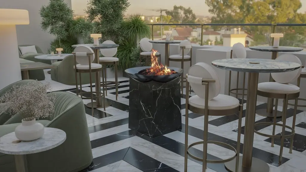 The Dawn bar table The Dawn bar table adapts effortlessly to a variety of environments, ensuring a refined atmosphere for every occasion. Its contemporary aesthetic and durable composition provide both beauty and functionality, offering a stylish setting for drinks or intimate gatherings.High quality materials are used, recognized for their durability and resistance, namely marble for the table top and its stainless steel structure.The ability to adapt to the layout of the outdoor environment according to your needs and preferences is a valuable feature as it allows the table to be flexibly configured to suit different outdoor situations and activities.The whole design of this contemporary outdoor bar table was developed according to the following structure: - Top: Marble or acrylic;- Structure: Plated stainless steel or lacquered fiberglass;All Myface materials are from premium suppliers, engineered to offer the best performance possible outdoors.Water, Mold, Mildew, UV and Fading resistance are some of the characteristics that you can expect from both materials, that are available in a wide array of colors and patterns.