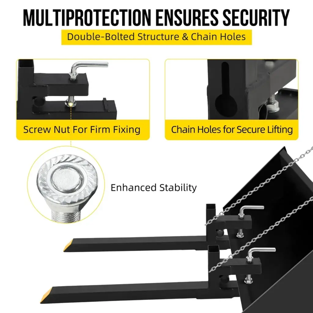 Clamp on Pallet Forks Heavy Duty: 60" 4000lbs Capacity Tractor Forks with Stabilizer Bar for Bucket Loader & Skid SteerProduct OverviewTransform your tractor into a versatile material-handling powerhouse with the TROPOW 60" Clamp on Pallet Forks. Engineered for heavy-duty use, these forks support up to 4,000 lbs and feature a universal quick-attach design compatible with most tractor loaders and skid steers. Constructed from high-strength square iron tubes, they include an adjustable stabilizer bar (19.5"¨C36" range) to prevent load shifting and ensure safety when moving pallets, lumber, or construction materials. Ideal for farming, landscaping, and industrial tasks, these forks eliminate the need for dedicated attachments while delivering professional-grade performance.Key Features & Benefits4,000 lbs Load CapacityBuilt from reinforced square iron tubes to resist bending or deformation under heavy loads.Reliably handles pallets, logs, construction debris, and industrial materials.Universal CompatibilityClamp-on design fits mainstream tractor buckets (John Deere, Kubota, etc.) and skid steer loaders without requiring permanent modification.Quick-attach mechanism allows for fast installation and removal.Adjustable Stabilizer BarEnhances stability for wide or uneven loads by preventing fork separation.Adjusts from 19.5" to 36" to accommodate varying load widths.Versatile ApplicationsPerfect for farming (hay bales, feed bags), construction (lumber, steel beams), landscaping (debris, rocks), and logistics (palletized goods).Replaces dedicated forklifts for occasional or frequent use.Durable & Safe DesignPowder-coated finish resists rust and corrosion in outdoor environments.Clamp bolts feature reinforced threading to maintain grip under stress.Technical SpecificationsBrand: TROPOWProduct Type: Clamp-On Pallet ForksLoad Capacity: 4,000 lbs (total)Fork Length: 60¡å (total); 43¡å (working length)Material: High-Strength Square Iron TubeStabilizer Bar Range: Adjustable from 19.5¡å to 36¡åCompatibility: Fits tractors with bucket loaders and skid steers (e.g., John Deere, Kubota)Included Components:1 pair of pallet forks1 adjustable stabilizer bar1 user manualWeight: Designed for easy attachment by one operator (exact weight not specified)