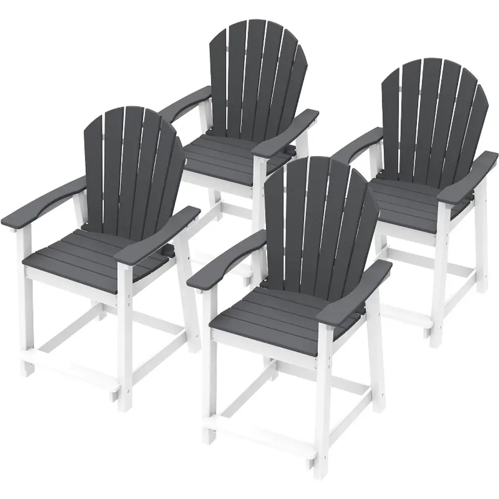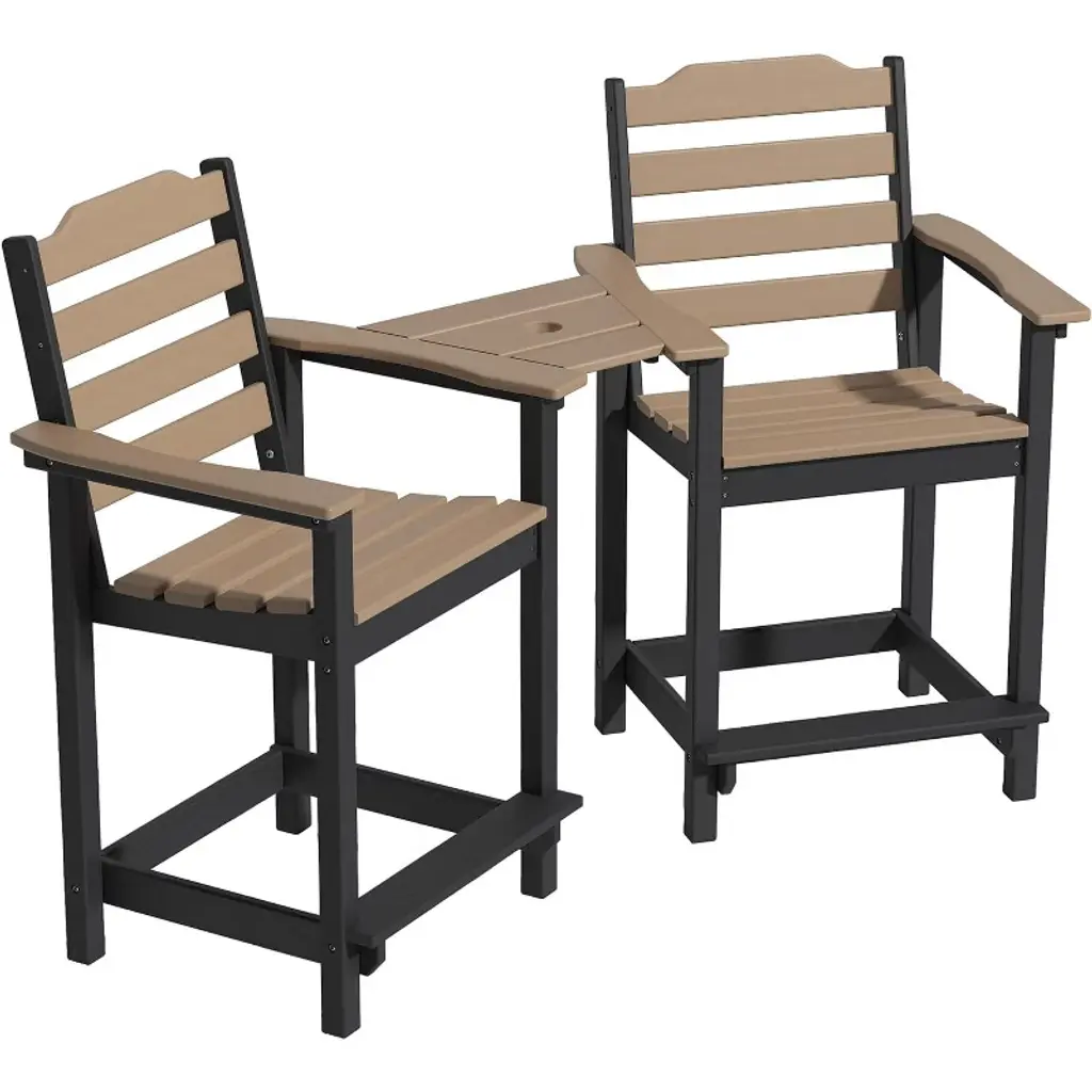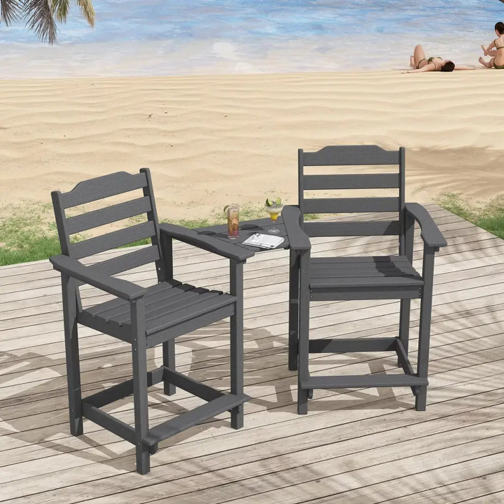 Modern 2-piece bar set with integrated drink table. Features slatted backrests, wide armrests, and built-in footrests. UV-resistant eco-materials withstand outdoor use. Dimensions: Chair 30.55"H | Seat 18.5"H | Table 16.61"x13.86". Ships semi-assembled.