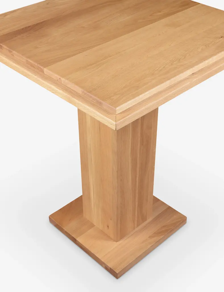 The Severo table pairs clean impact with modern warmth. This bar table is crafted from solid oak, featuring a double square top and an architectural post base that showcases a rich, natural grain. Pair it with bar stools for an elevated take on casual gathering.