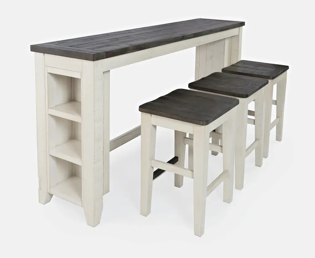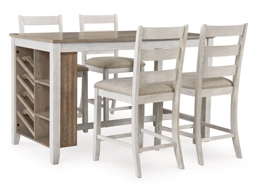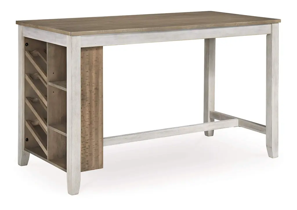Raise the bar on small space living with the Skempton 3-piece counter-height dining set. An inspired choice for coastal chic or modern farmhouse settings, this strikingly simple table marries a brown tone plank-effect top with a rubbed-through grayish white base for timeworn appeal. The table’s side shelves and 8-bottle wine rack cleverly balance form and function while the comfortably cushioned bar stools serve up high style.