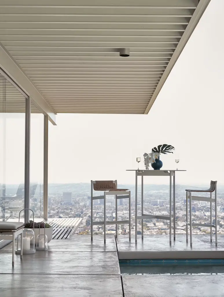 For the Sommer Outdoor Collection (2019), Copenhagen-based designer Chris Halstrøm wanted to give people the experience of indoor furniture in outdoor spaces. She brought the clean, airy lines of modern furniture into a durable, compact bar table made from powder-coated aluminum. Made in Indonesia.