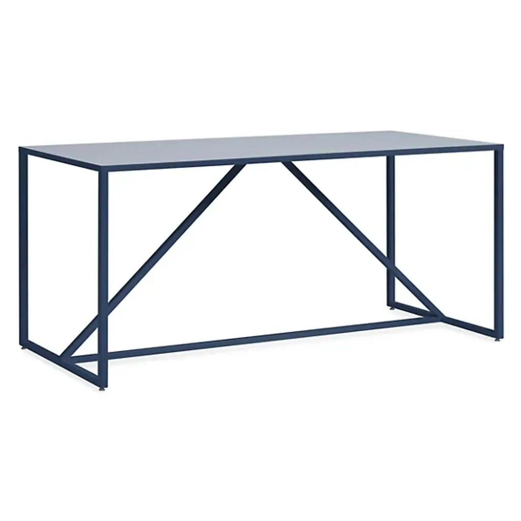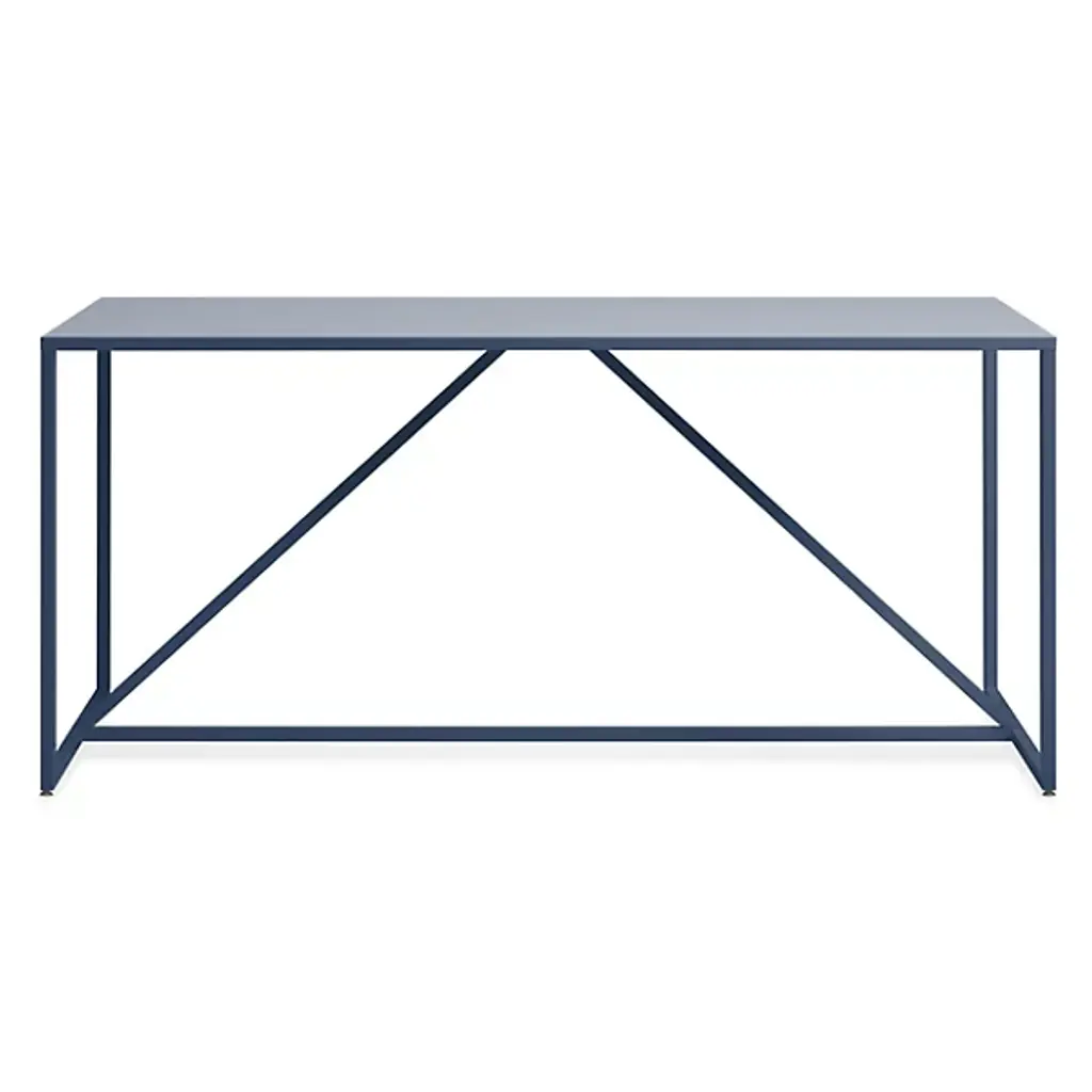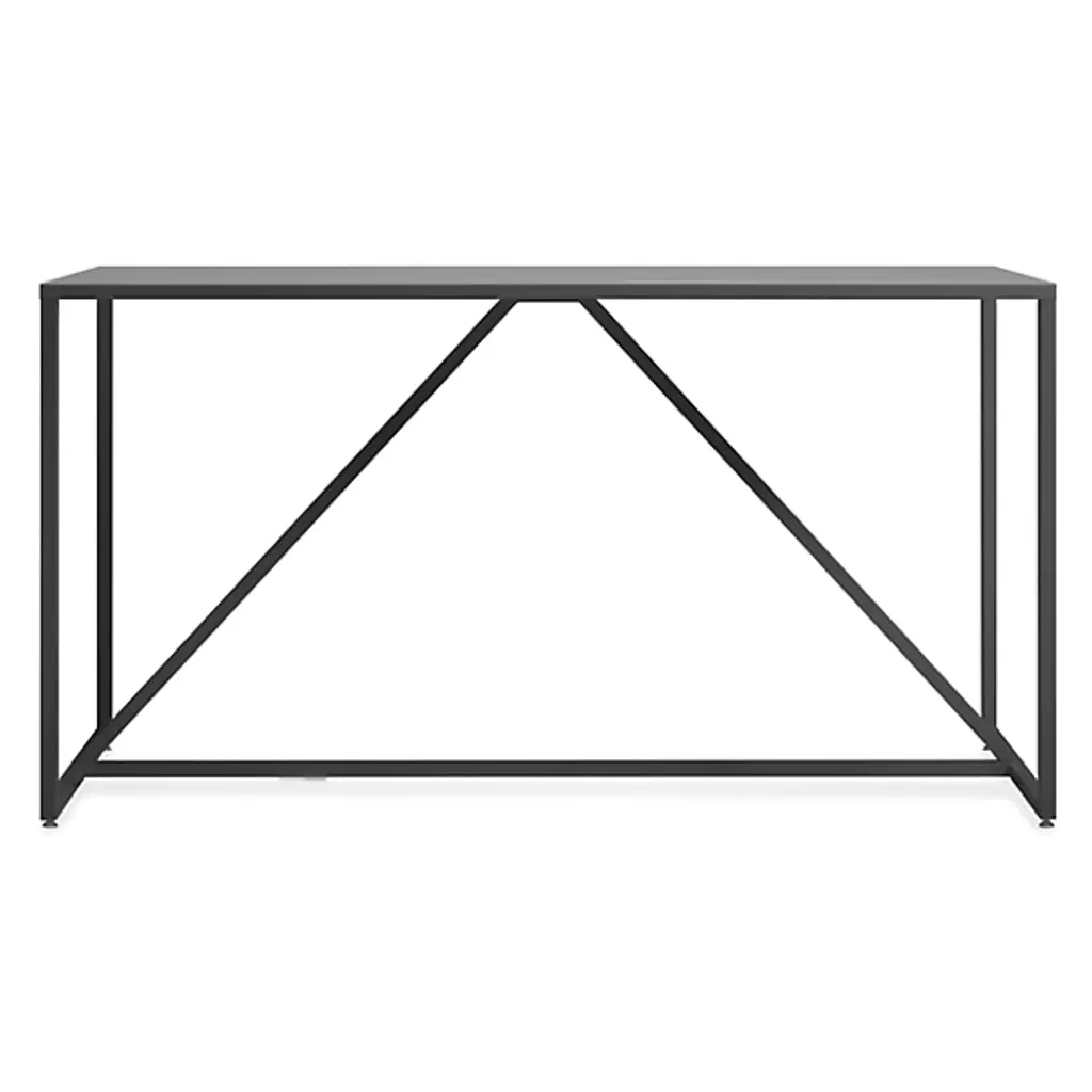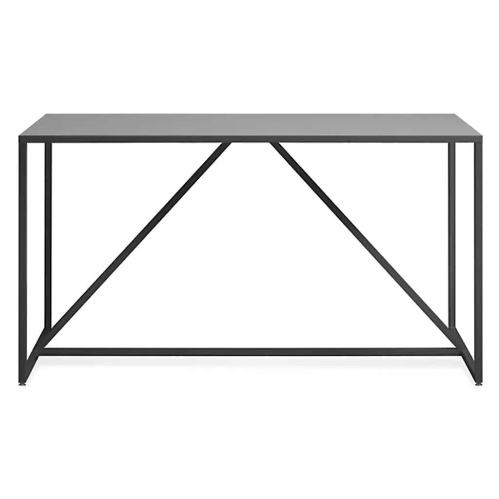 Enjoy an elevated lunch or a couple of drinks atop the Strut Bar Table from Blu Dot. A triangular strut element angles at the center to support the structure and create a cool contemporary outline. The slender steel framework moves in sharp angles throughout; its airy form creates more for one's chair and lower body for a more comfortable seating experience. A wooden table surface blends with the color of the metal structure, adding a touch of organic flavor to a refined design.