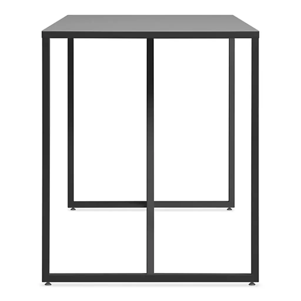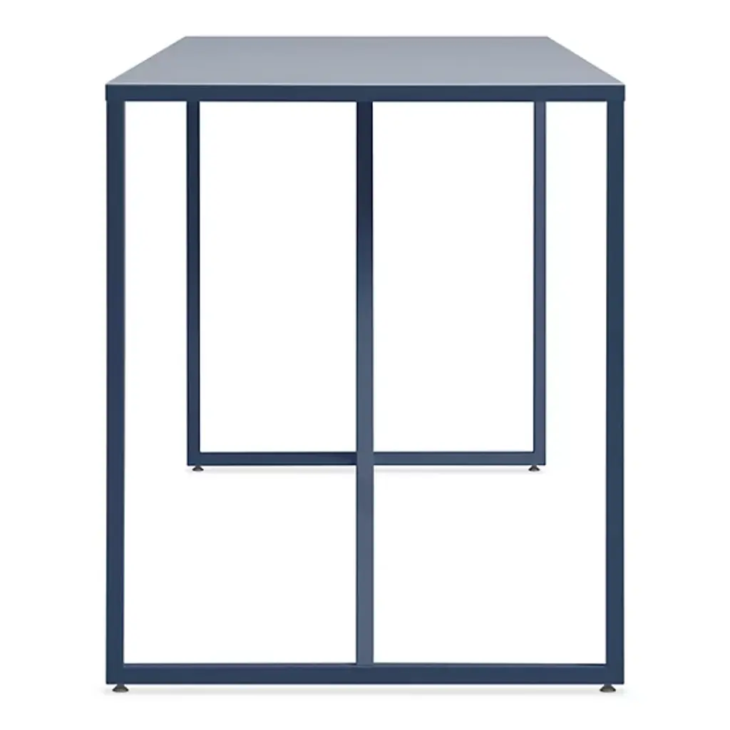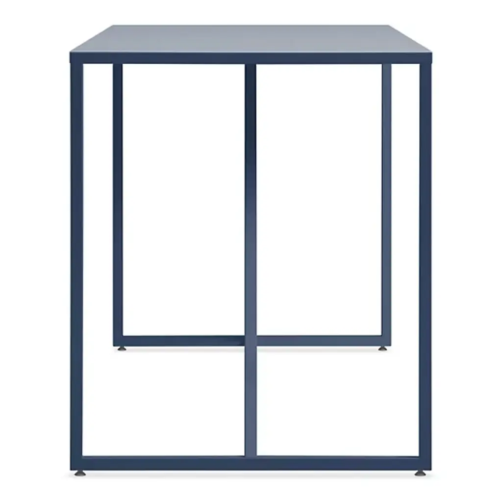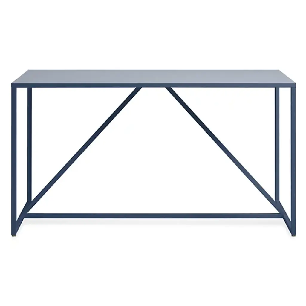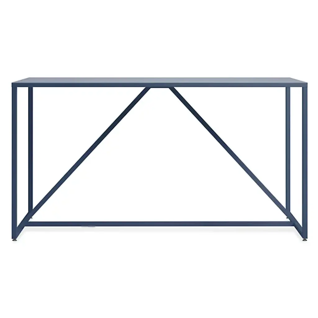 Enjoy an elevated lunch or a couple of drinks atop the Strut Bar Table from Blu Dot. A triangular strut element angles at the center to support the structure and create a cool contemporary outline. The slender steel framework moves in sharp angles throughout; its airy form creates more for one's chair and lower body for a more comfortable seating experience. A wooden table surface blends with the color of the metal structure, adding a touch of organic flavor to a refined design.