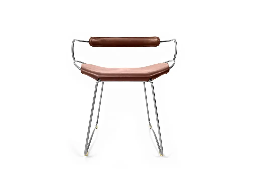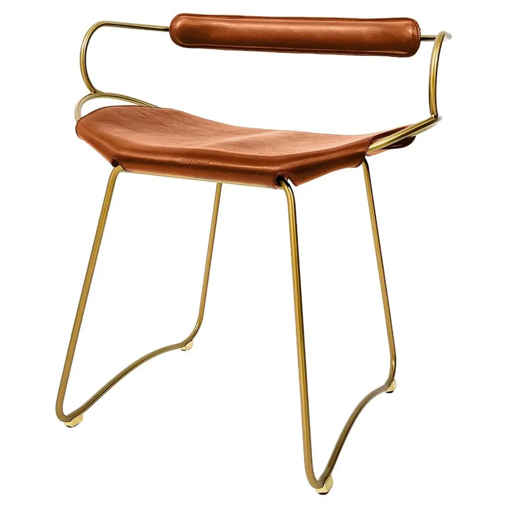 The Hug contemporary table stool with backrest is designed and conceived with a light aesthetic, the slight oscillation of the steel rod of 12 mm is complemented by the flexibility of the double 3.5 mm thick leather. When sitting in this furniture you feel an enveloping sensation, like being hugged, since the weight of the body is distributed evenly. Each unit becomes a refuge of visual and ergonomic wellbeing.Our Hug Collection is inspired by the organic lines of a landscape, the curves of nature, and the imaginary silhouette of the wind inspire this collection of organic forms, almost like metallic sculptures. All pieces are done with cold bended steel rods, polished, nickel plated, colored by electrolysis, and lacquered. The process of polishing and lacquering the steel, goes through a manual and delicate chroming process, which gives its final and unique metal color finish. This precise technique gives a uniform metallic finish of minimum 50 microns over the entire Surface. Our metal finishing has successfully passed a corrosion resistance test in a salt spray chamber according to UNE-EN ISO 9227: 2017 and UNE-EN ISO 1456: 2010. Our signature screws are made with brass turning lathed, polished, and lacquered, these are the pieces that fix the saddle leather to the metal frame.Leathers are Spanish hides vegetable tanned. We use premium saddles in multiple colors to adjust to your taste and interior needs. This traditional vegetable dying and tanning method is an organic technique that relies on natural tannings from bark or plant tissues. The use of oils and natural fats give the leather a distinctive flexibility and texture, allowing it to be molded, retain its shape and age graciously.All skins are carefully selected from food industry, with a minimum thickness of 3.5 mm / 0,02 in, using the part of the animal's shoulder, which allows for larger pieces and uniformity, even though signature wrinkle from the animal’s neck may be recognizable. The vegetable tanning is a traditional and artisan treatment, which is respectful to the environment. Even with careful selection natural marks as a result of the contact with other animals, the age, origin and characteristics of the skin, or even the season in which the tanning takes place cannot be avoided. We still believe that these factors only add authenticity and uniqueness to every piece. Our leather parts are made with double saddles, always showing the top side of the hides that presents the better quality.Customization options.With the aim of creating customized pieces, clients can select from the various metal finishes, and leather colors to create pieces that complement their home décor. Leather colors available, black, navy, dark brown, cognac and natural tobacco, and steel polished finishing available, aged brass, black smoke and aged silver.Normally we use tone on tone threats for stitches, but client can select a contrast option, being possible to select any color to make a unique piece for the project it belongs. The finish on the edges of our leather components are sanded and hand painted. We have the option of select an alternative color if not tone on tone will be applied.Our collections are made to full fill home spaces where to gather and enjoy great conversation with families and friends. Occasional furniture for exquisite homes, from cottages to exclusive resorts. Our product is understood as a sculptural piece of design, as an art object to be displayed at different house spaces as library, bar, living, foyer, bedroom, powder, meeting, grand or great room.The different finishes options make the furniture perfect combinations on diverse styles, from rustic mountain home, a small cottage, a ski lodge retreat, or industrial a minimalist look.