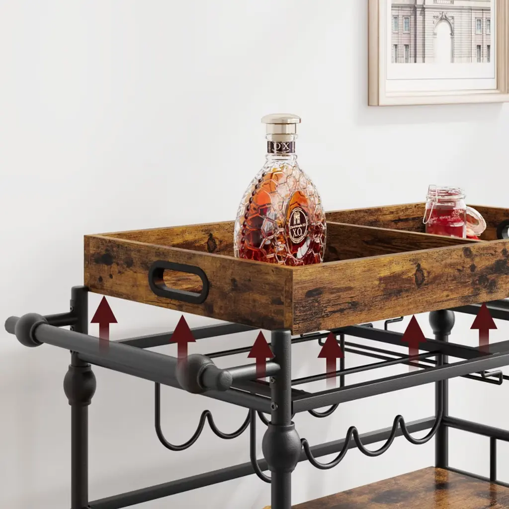 Brown 3-Tier Rolling Bar Cart with Wine Rack & Stemware Holders – Vintage-Style Mobile Serving Cart for Home & EntertainingProduct Description:Elevate your hosting experience with this elegantly designed grey bar cart, blending vintage charm and modern functionality. Its spacious three-tier layout includes a dedicated wine rack and stemware holders, offering organized storage and effortless serving convenience. Equipped with smooth-rolling locking wheels and a removable top tray, this cart is perfect for use as a mobile bar, coffee station, or party serving center in your living room, dining area, or kitchen.Key Features:🛒 Elegant Retro-Style DesignRoman column-inspired metal frames and handles paired with wood-grain shelves bring timeless sophistication to any space. The refined grey finish and vintage details complement both modern and classic interiors.🌀 Smooth Mobility with Locking WheelsFour 360° swivel casters—two with locking mechanisms—allow easy movement between rooms and secure placement when serving. Glides effortlessly across hard floors during gatherings or stays stationary for daily use.🍷 Ample and Organized StorageThree large tiers (measuring 34.65"L x 19.09"W) provide plenty of space for bottles, glassware, and accessories. The built-in wine rack holds up to 4 bottles, and stemware hangers keep 8 wine glasses secure and accessible.🥂 Removable Serving Tray & Secure DesignThe top tier doubles as a portable tray for carrying drinks and snacks. Raised edges on each shelf prevent items from sliding, while the open-front design offers quick access to stored goods.🏡 Versatile Entertaining and Storage UseMore than just a bar cart, it serves as a movable coffee bar, kitchen organizer, dessert display, or party station. Crafted with a sturdy metal frame and reliable MDF shelves, it balances durability with everyday elegance.Specifications:Color: Grey/BrownMaterial: Metal Frame + MDF Shelves (Wood Grain Finish)Overall Dimensions: Multi-tier design; top tray removableWine Rack Capacity: 4 bottlesGlass Holder Capacity: 8 stemware glassesWheels: 4 x 360° swivel casters (2 lockable)Use Case: Living room, kitchen, dining area, patio, partiesIdeal for homeowners who love to entertain, this bar cart combines style, storage, and mobility in one functional piece. Whether you’re hosting a party or organizing your kitchen, it offers practical elegance for every occasion.