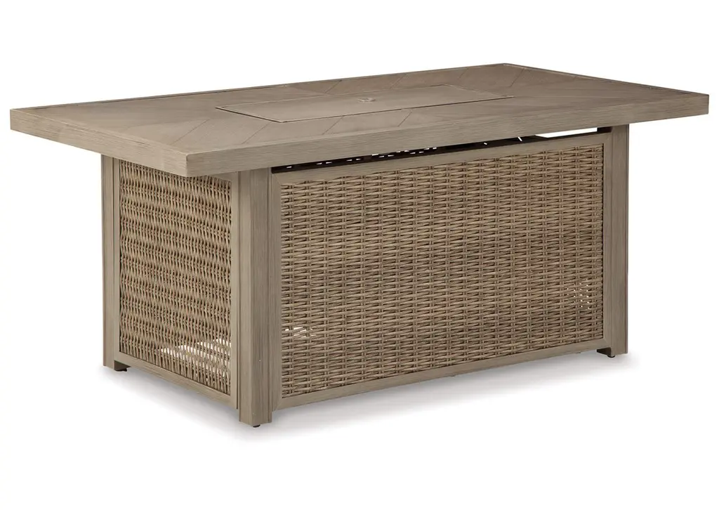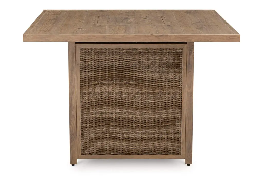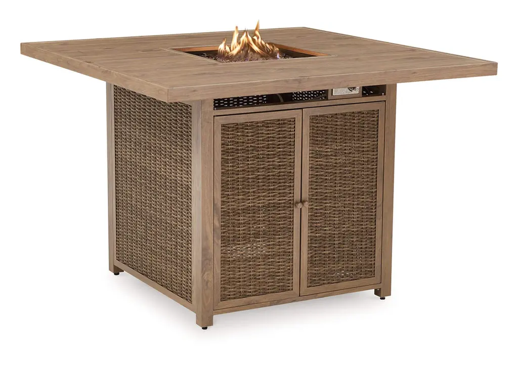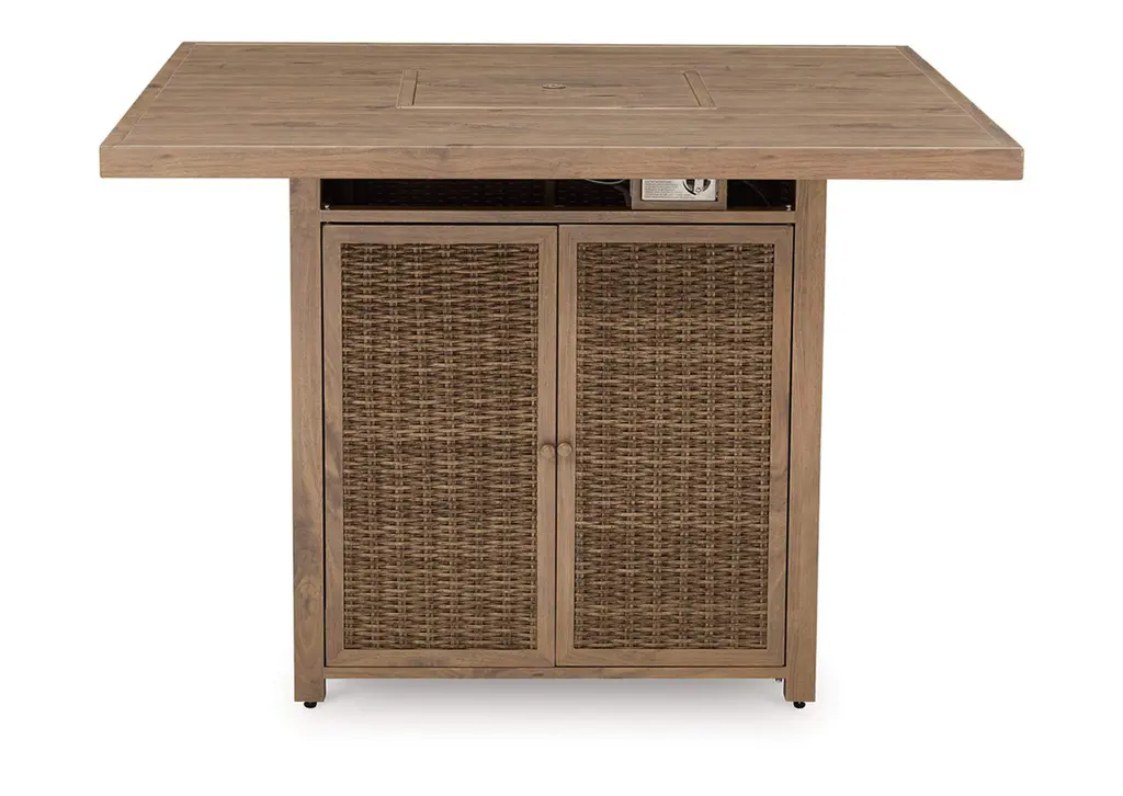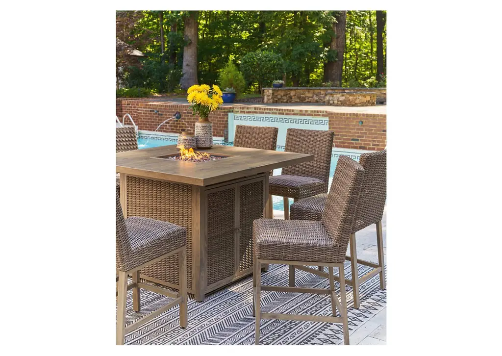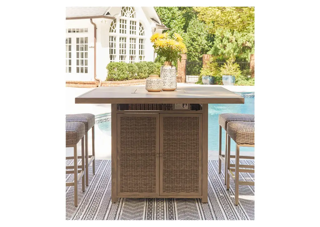 A perfect balance of design and utility, the Walton Bridge bar table with fire pit turns any outdoor living space into your own piece of paradise. Crafted with easy-care resin wicker over an aluminum frame with the look of wood, it's the epitome of California dreamin' style. The press of a button ignites a flickering flame that dances over a bed of glass beads. And with room for up to eight, it’s one highly accommodating table. Weight 138.000 lbs. (62.1kgs.)