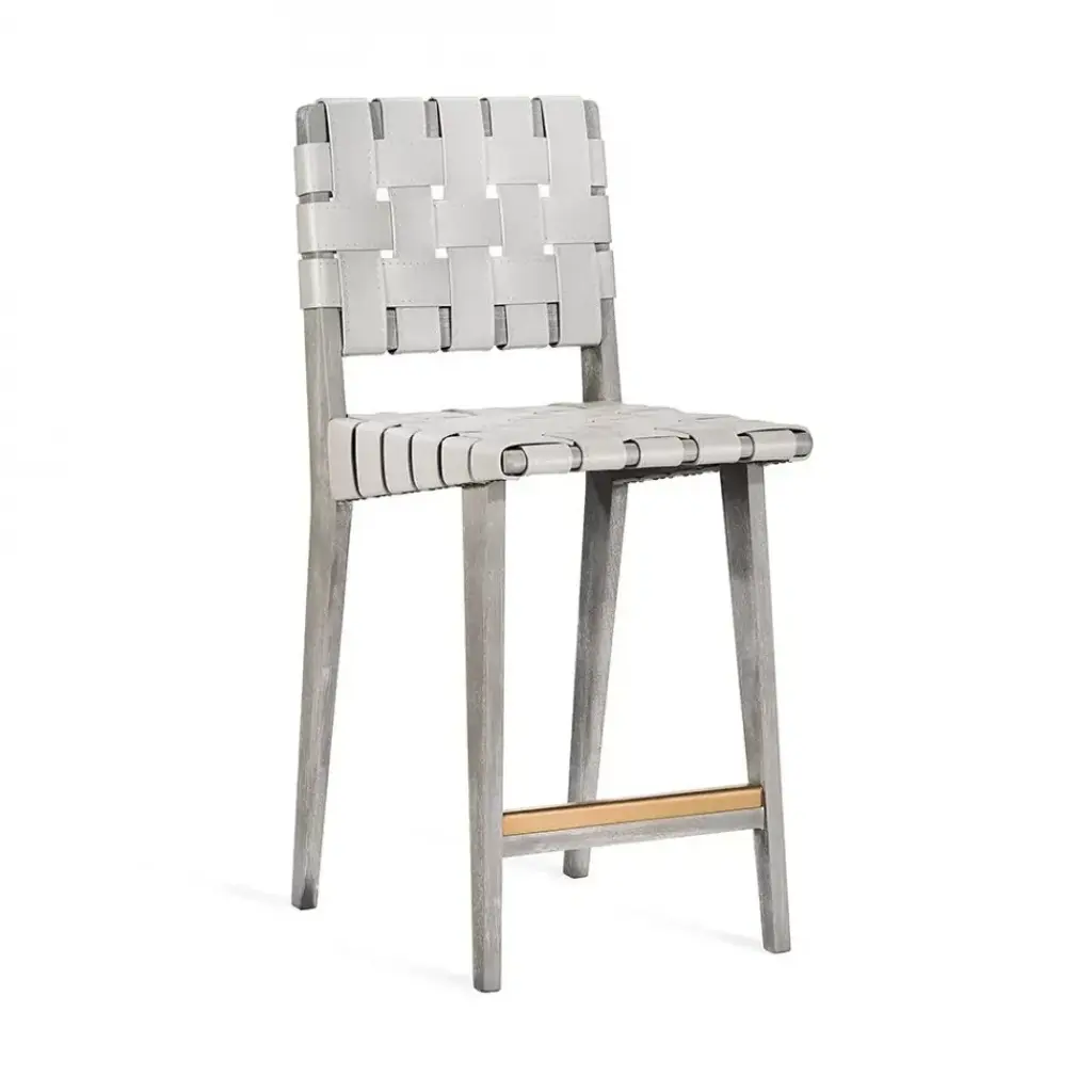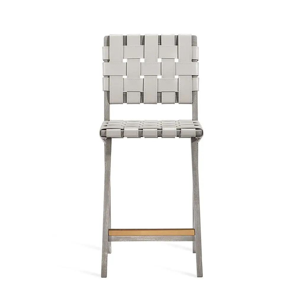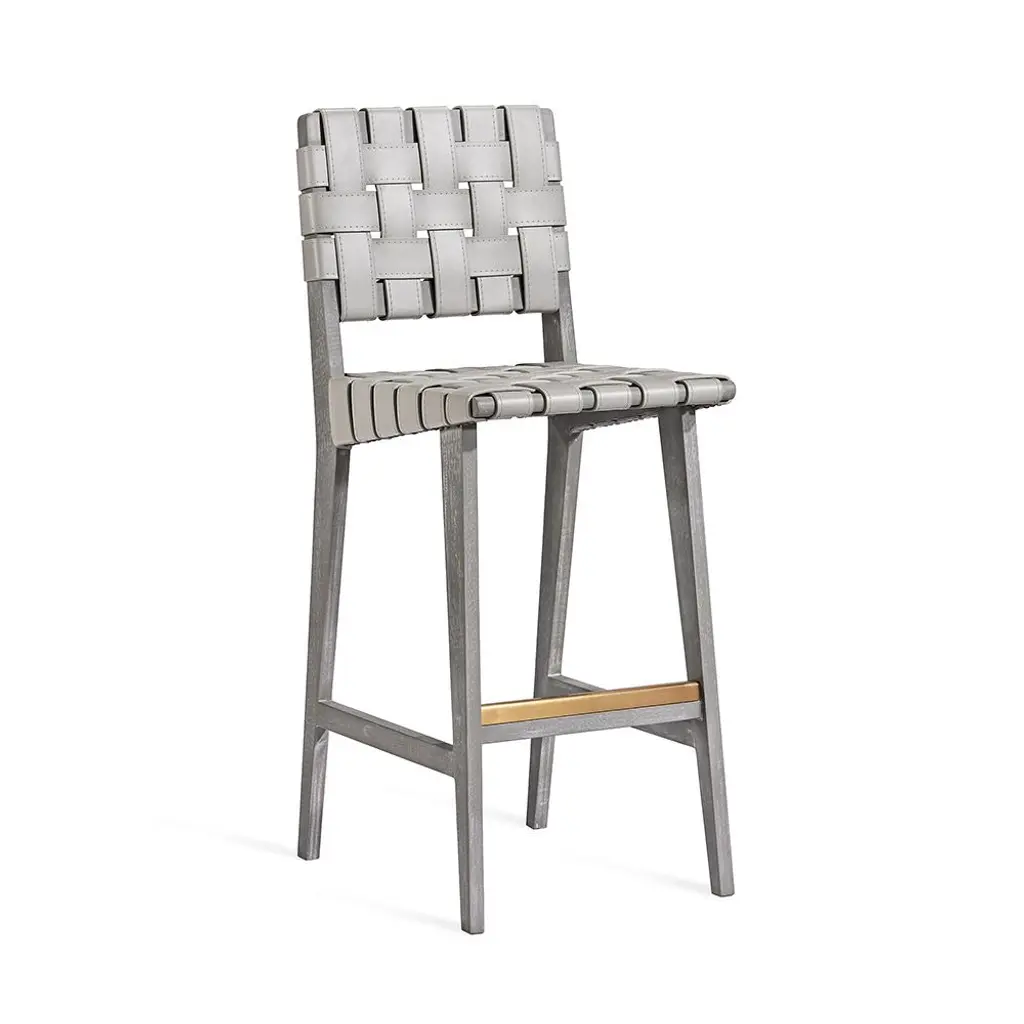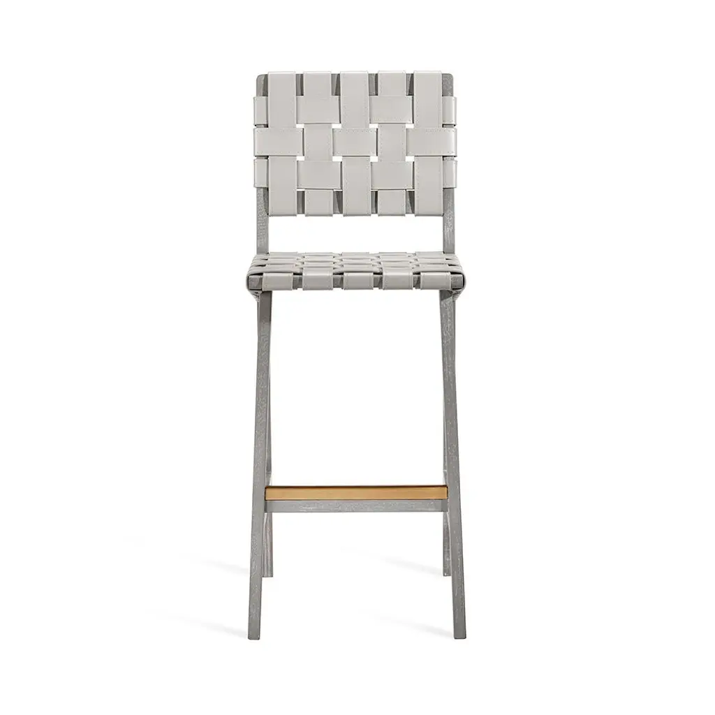 An Of-The-Moment Update To A Classic, The Louis Counter And Bar Stool Features Woven Light Grey Leather On A Grey Wash Frame With Antique Brass Nail Heads.
