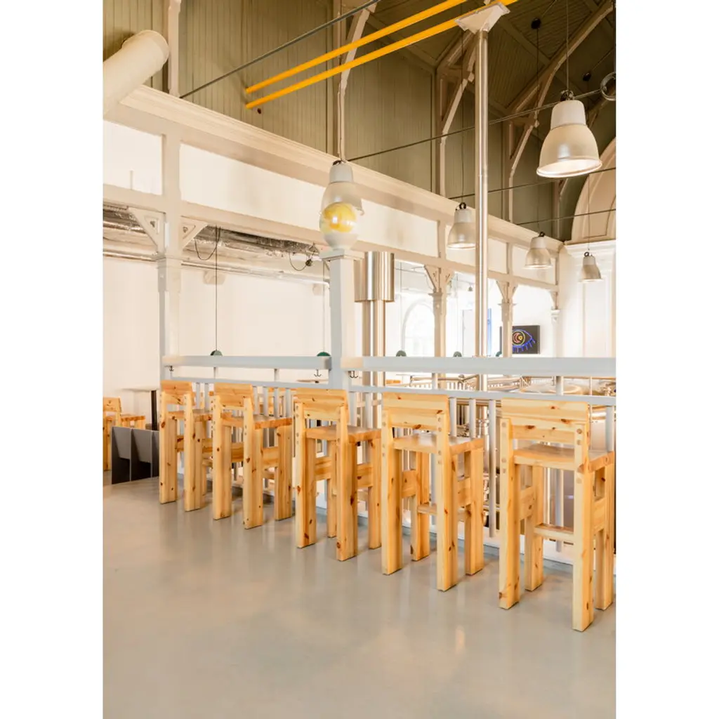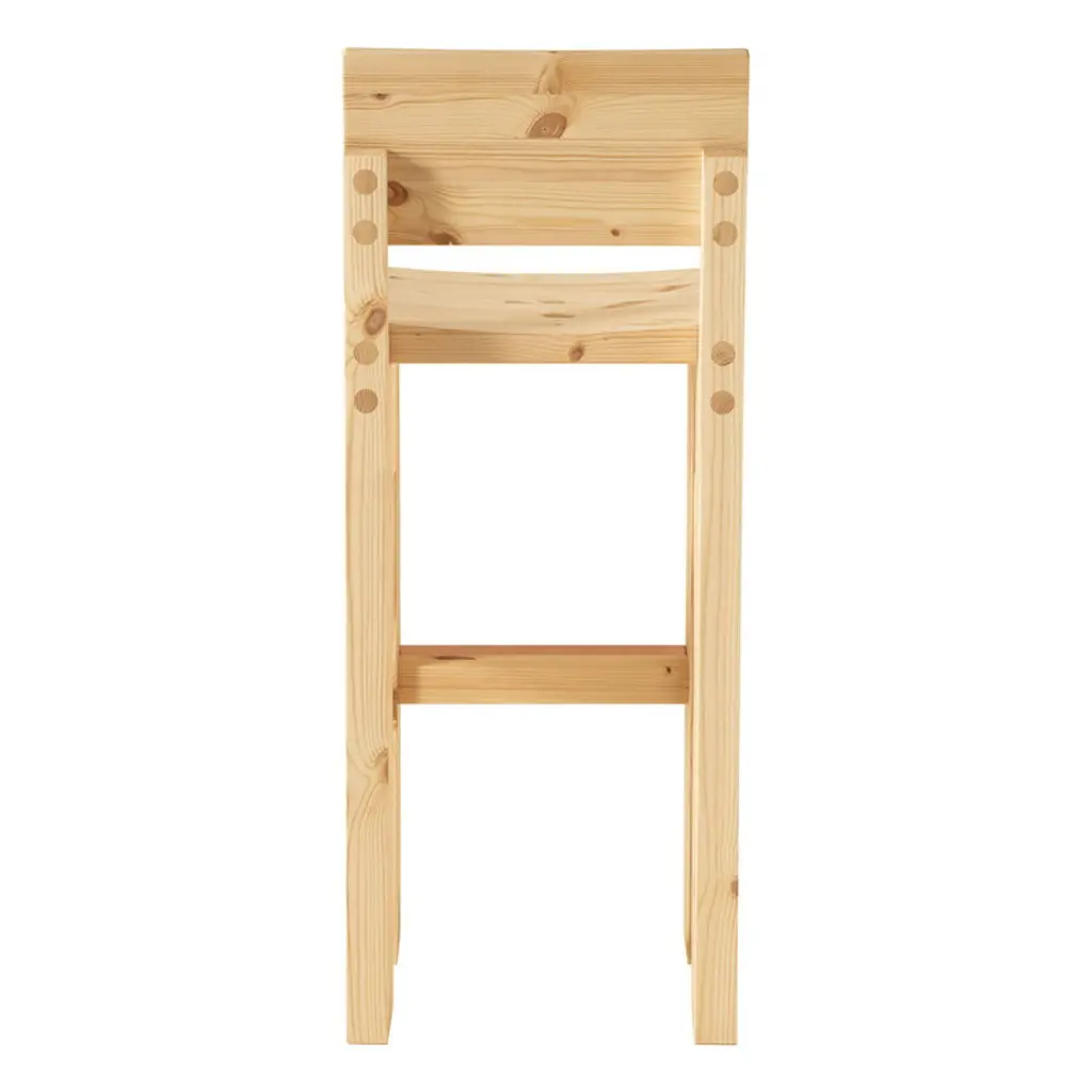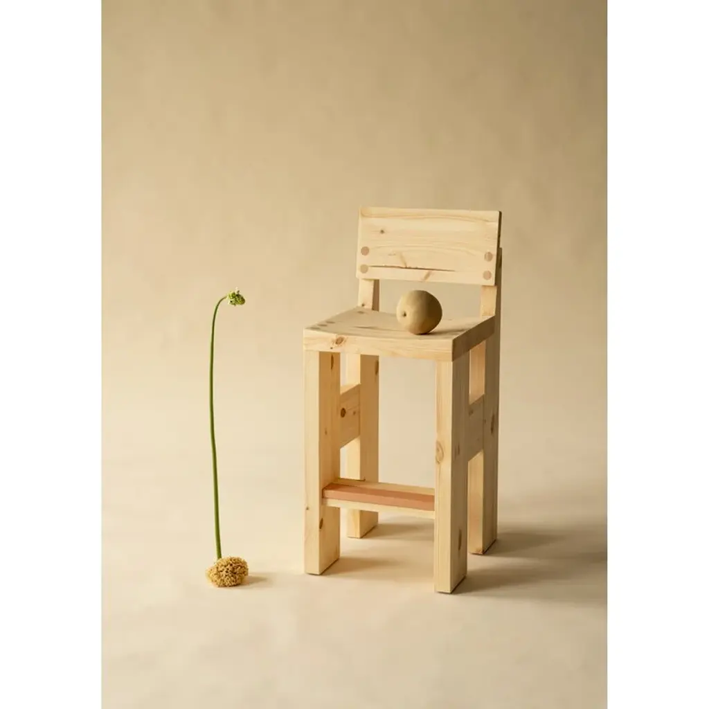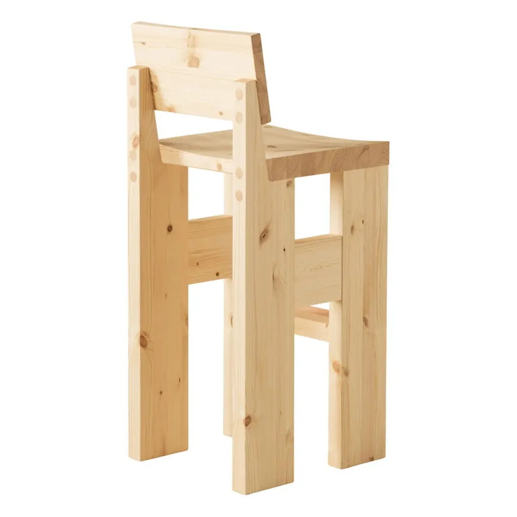 Vaarnii’s pinewood bar stool may look stiff and angular, but thanks to the curved seat, it is surprisingly comfortable to sit on. The dimensions of the chair, designed by Fredrik Paulsen, are also restrained in relation to its sturdy shapes. As a practical detail, there is a groove under the seat, allowing you to pull the chair out more easily. In addition to the brutal design language typical of Paulsen's design, there is another element favored by Paulsen heavily present in the bar chair: pinewood. According to the designer, the natural knots and grain of pine form fascinating patterns that are downright “psychedelic”, and they look best on large surfaces – hence the bulky design. Pinewood also ages quite beautifully due to the oils and resins that naturally occur in the wood, turning into a rich honey color as the wood is exposed to UV rays.
