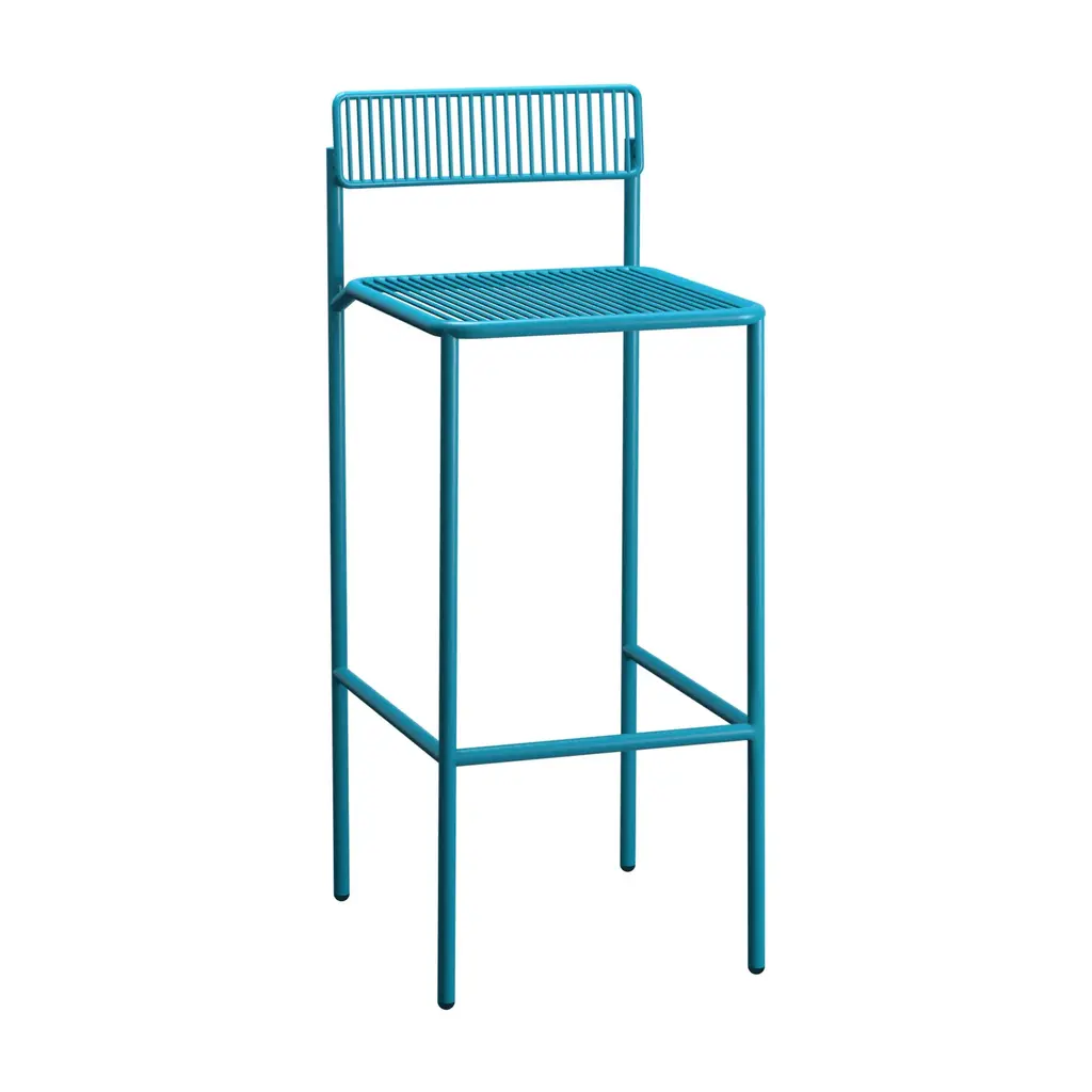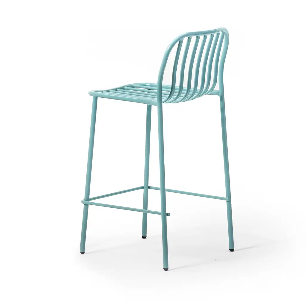 Offered in a bright turquoise finish recalling dreamy tropical waters, the solid cylindrical metal frame of this bar stool guarantees lightness and freshness. Multiple bars make up the backrest, whose rounded contours soften an otherwise too rigorous general silhouette. Please refer to the Concierge for inquiries on customization options, outdoor/indoor versions, and optional seat cushion.