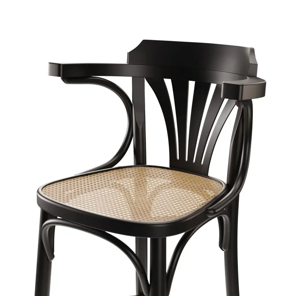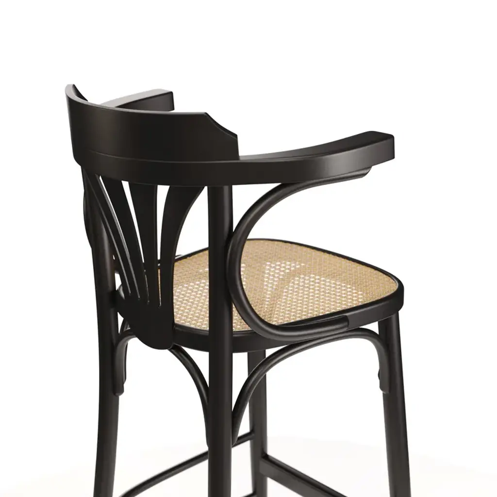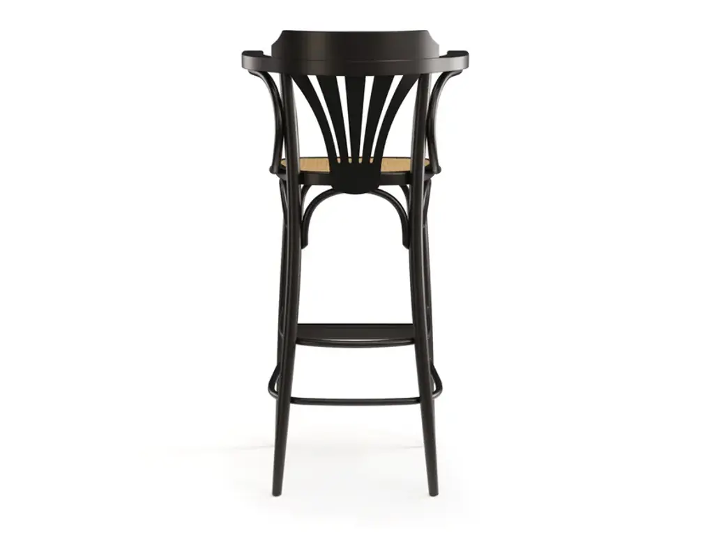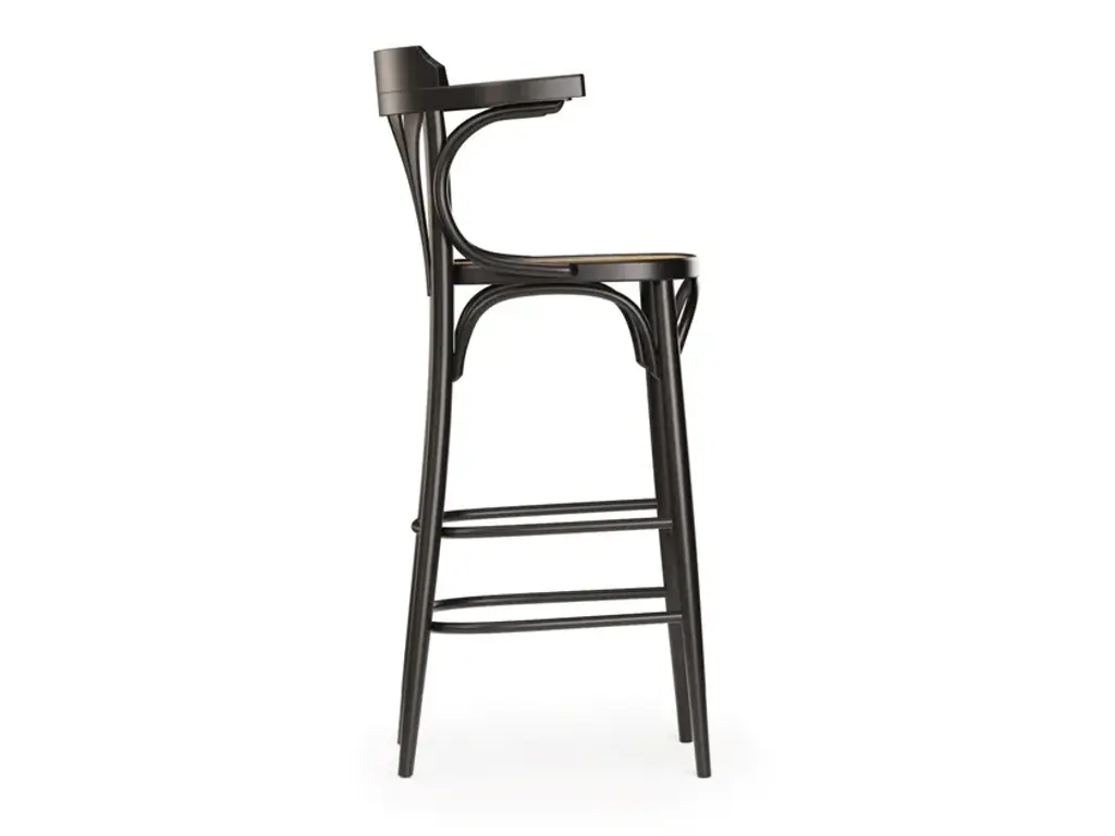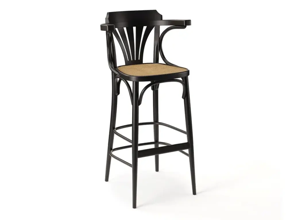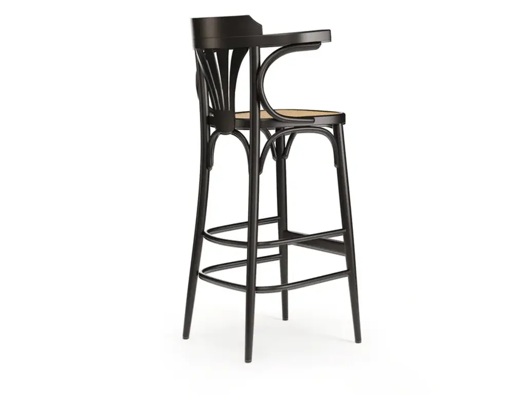A barstool with armrests and a distinctive plywood fan backrest. The upholstered version can be accessorised with decorative studs, or a cane weave can be added instead. The front legs can be connected by a metal plate to protect the wood from the weight of the sitter’s feet.
