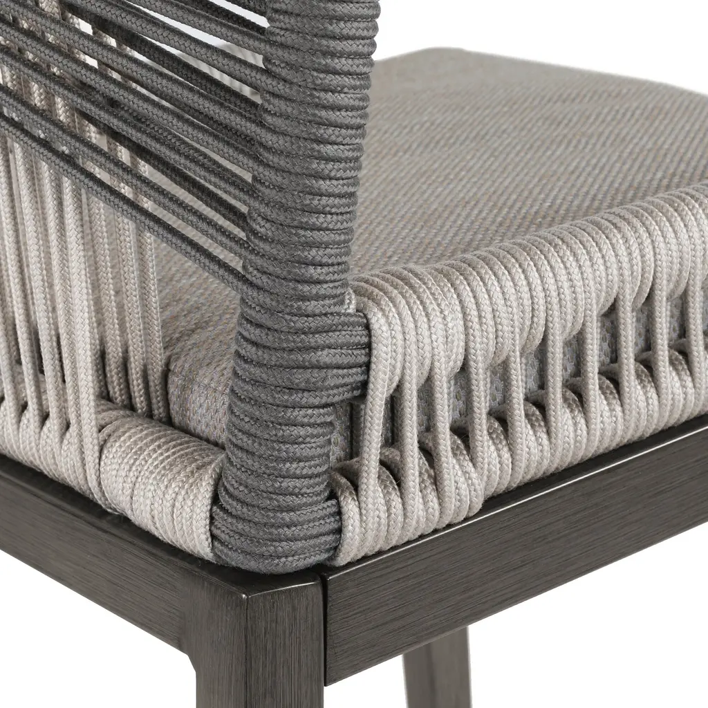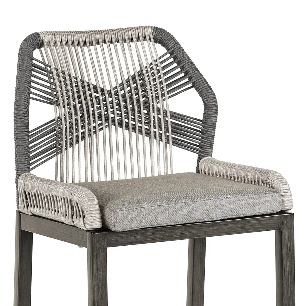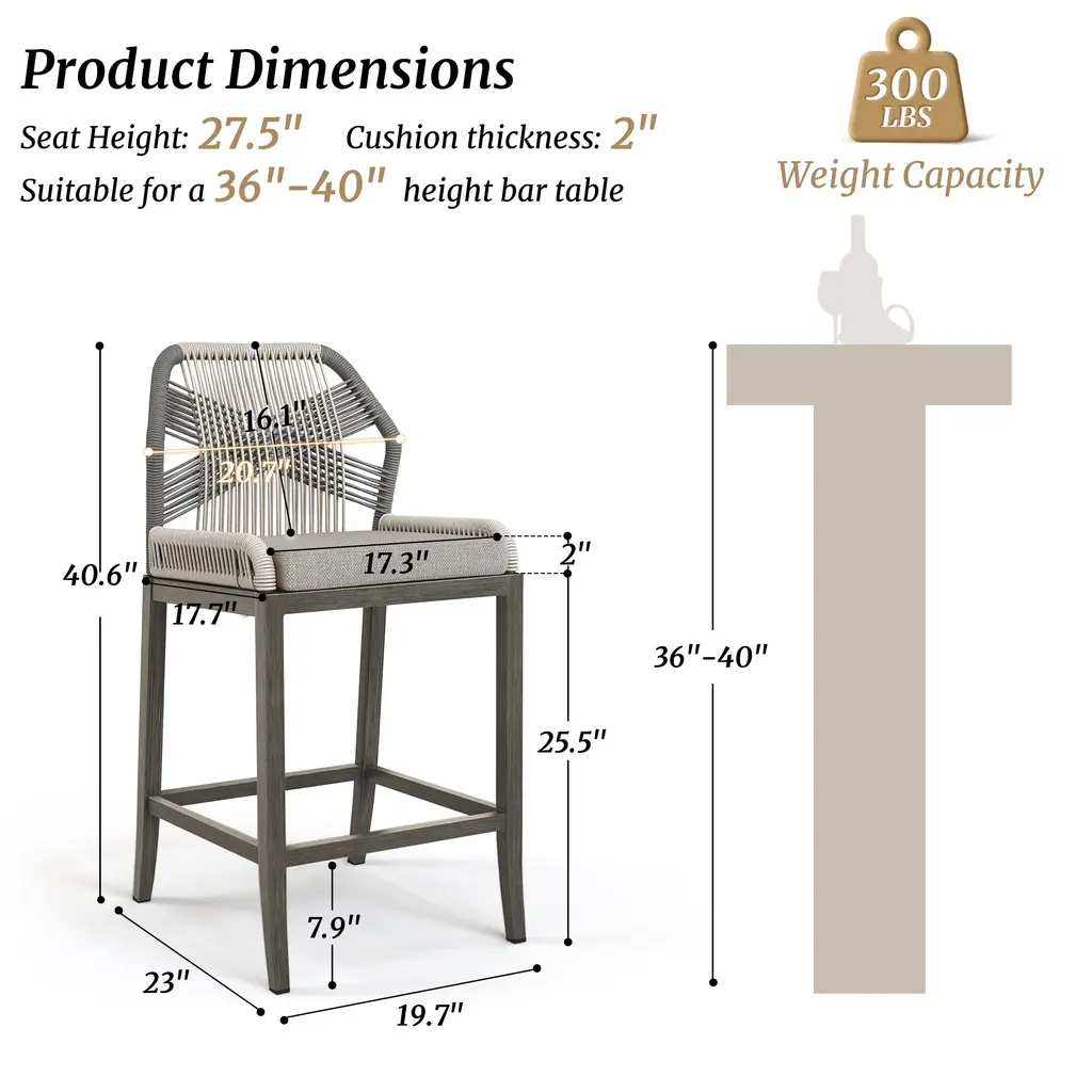 Details: The modern outdoor patio aluminum bar stool chairs with cushions will surely give your bar a new look. The bar chairs are decorated with a mix of beige and grey eye-catching cross-weaving ropes, and the stylish backrest and armrest can provide the ultimate comfort. The patio stool is made of high-quality all-weather polyethylene rattan, which is durable and UV resistant. The wood grain aluminum frame is sturdy and rust-resistant for long-term outdoor use. It can support up to 300 lbs. Features: Soft and elastic cushion: The cushion is made of soft and elastic material to provide comfortable seat support and cushioning, reducing fatigue caused by long hours of sitting. Good durability: The chair is crafted from durable, fade-resistant UV-resistant braid rope, making it ideal for outdoor use. Its stylish design ensures both durability and comfort, whether placed in the garden, on the balcony, or on the terrace, it is pleasing to the eye. Robust and rust resistant: The powder-coated aluminum frame with reinforced upgraded feet is designed to provide durability and stability. Multi-scene adaptation: suitable for outdoor patio, terrace, porch, indoor, kitchen island, family bar, restaurant, shop, etc. It comes with simple installation instructions for easy assembly.