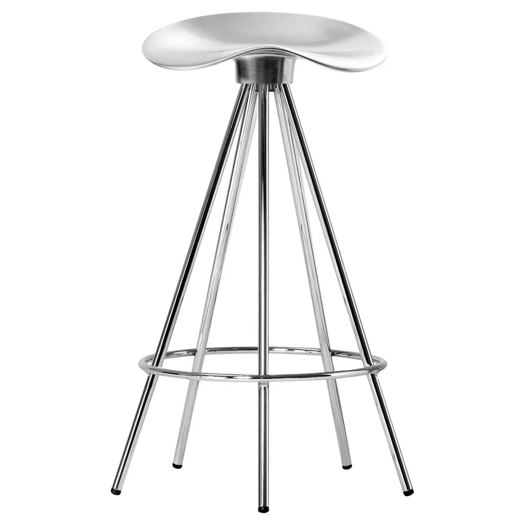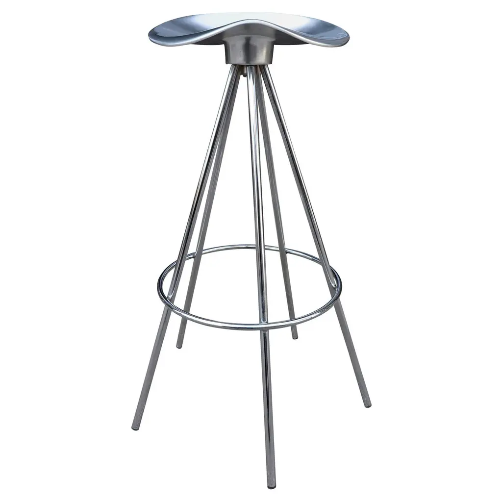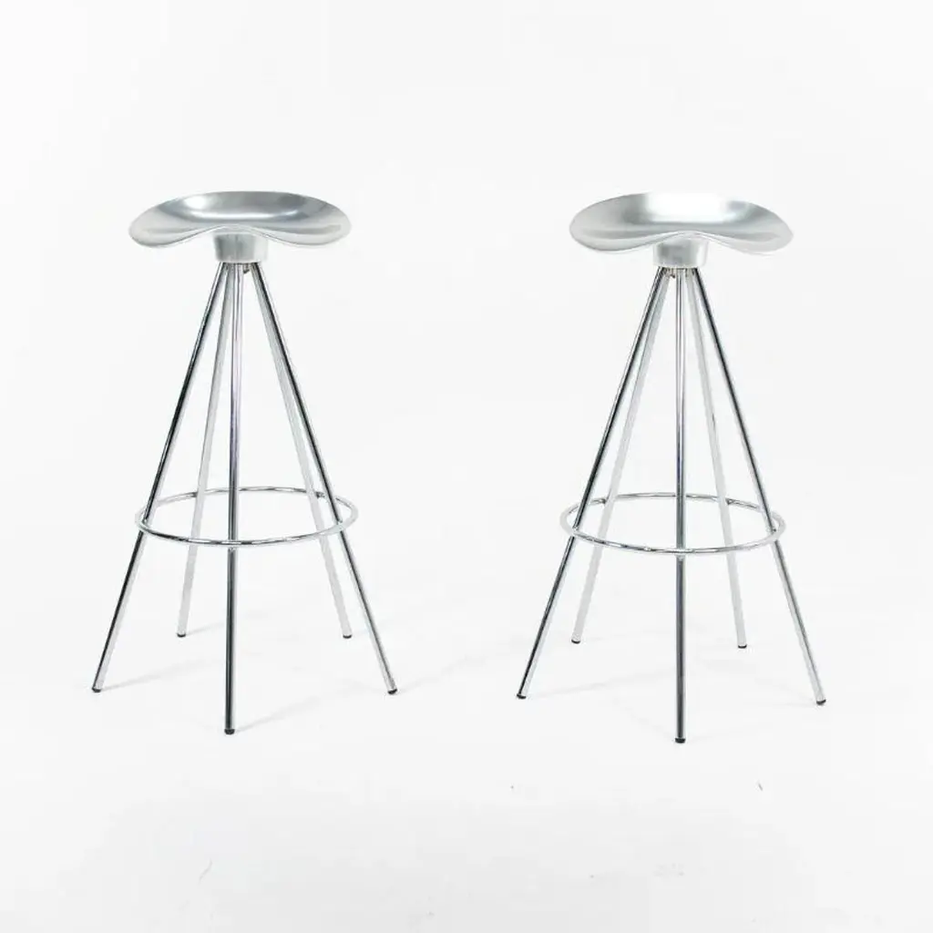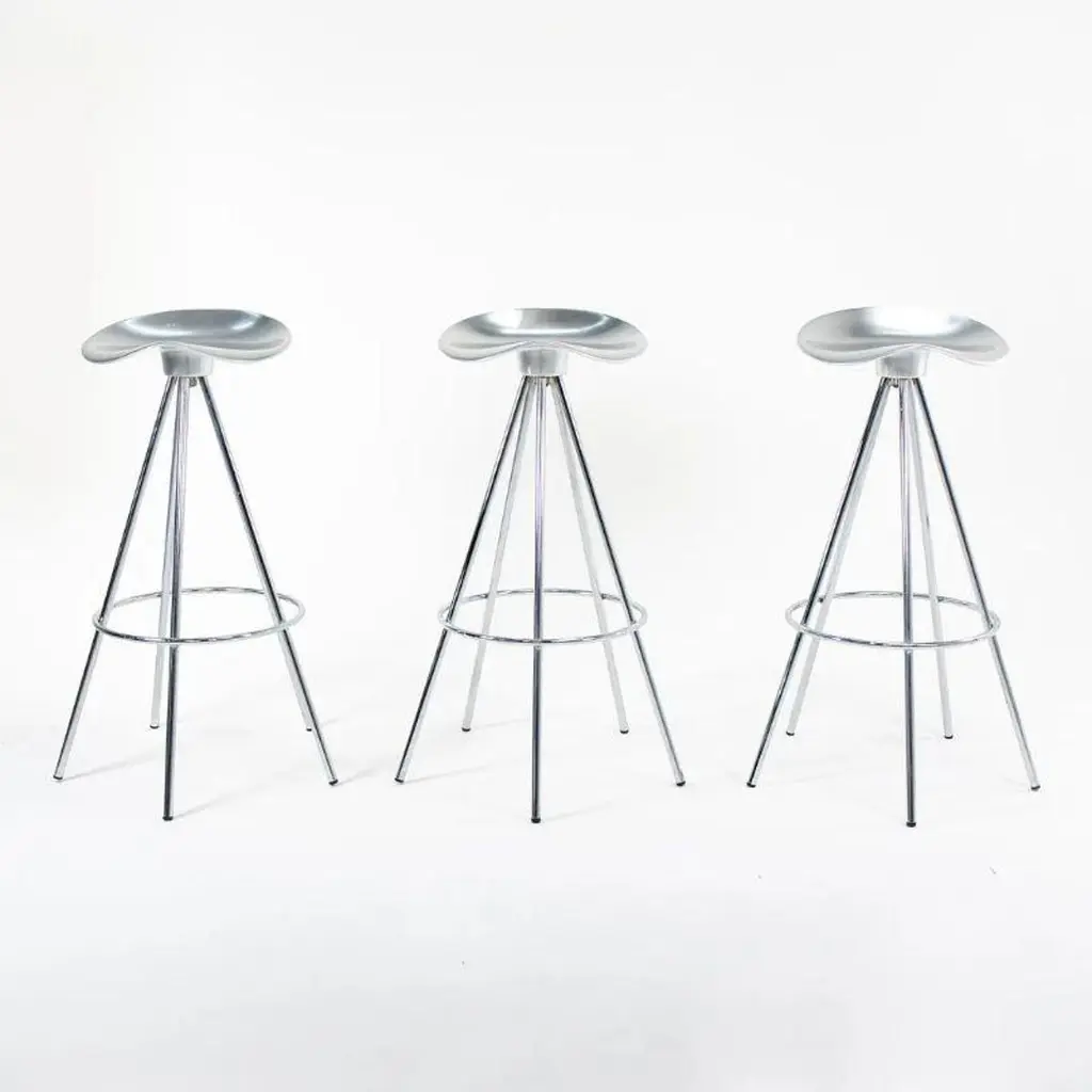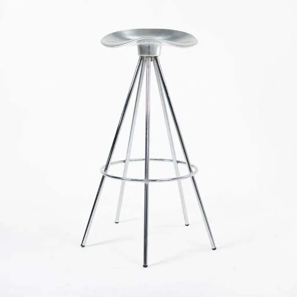 This is a single (multiple stools are available, priced individually) Jamaica bar stool, originally designed by Pepe Cortes for AMAT-3 in 1993. These stools are a later Knoll & AMAT-3 production from the 2000s. For context, Knoll was the US distributor or seller for AMAT-3 designs. The design incorporates a polished cast-aluminum seat, and has chromed steel legs. The Jamaica design is an important piece in the history of Spanish Design. The seat is sculpted in an ergonomic form that offers more comfort than one would think. While these appear quite modern upon first glance, this design plays well in various design schemes. The design has been on the market for over 25 years and has become a modern classic.The listed price includes one stool. Eight are available. Each stool measures 31.89 inches in height, 14 inches in width, and 13.25 in depth. The seat height is 30.32 inches. The stools are in excellent used condition with minor wear consistent with age. These are not the lower counter stools.