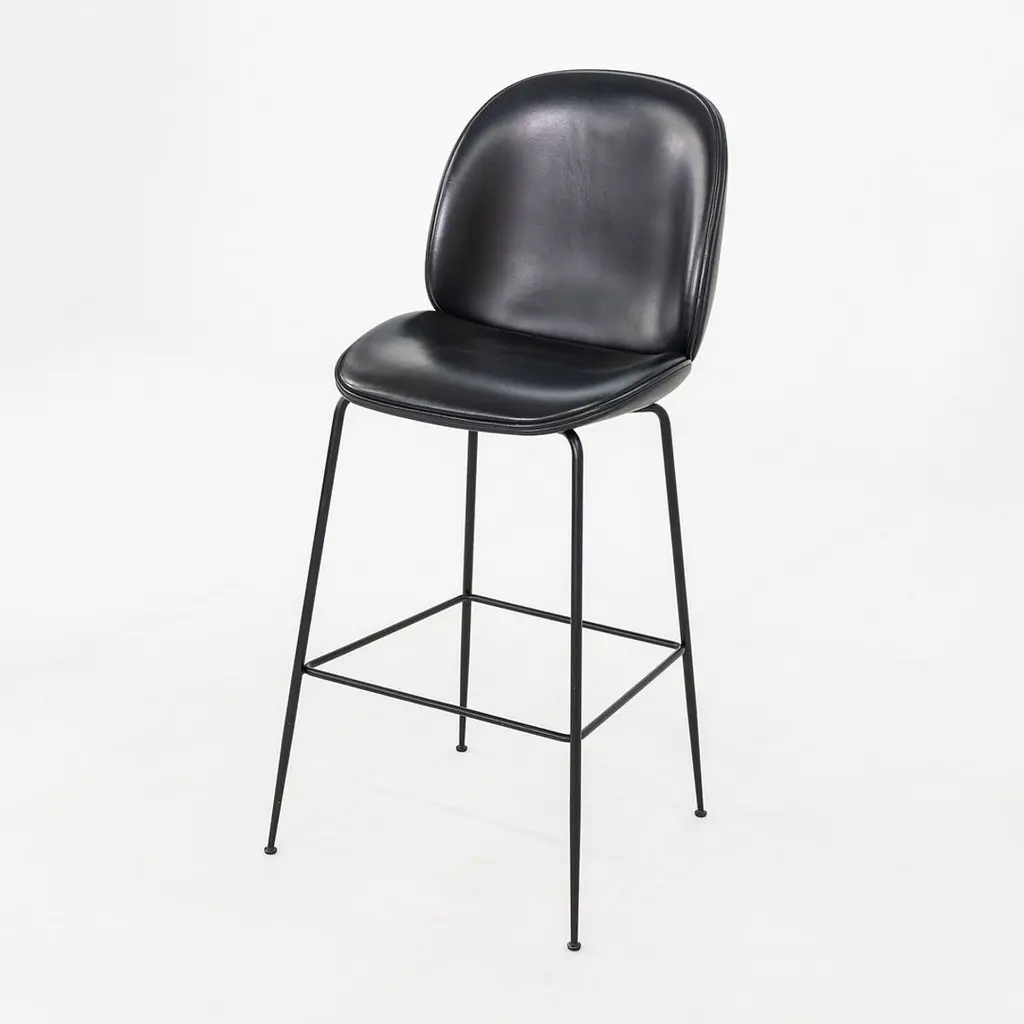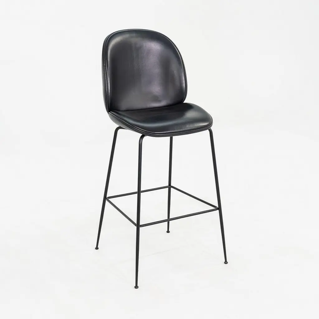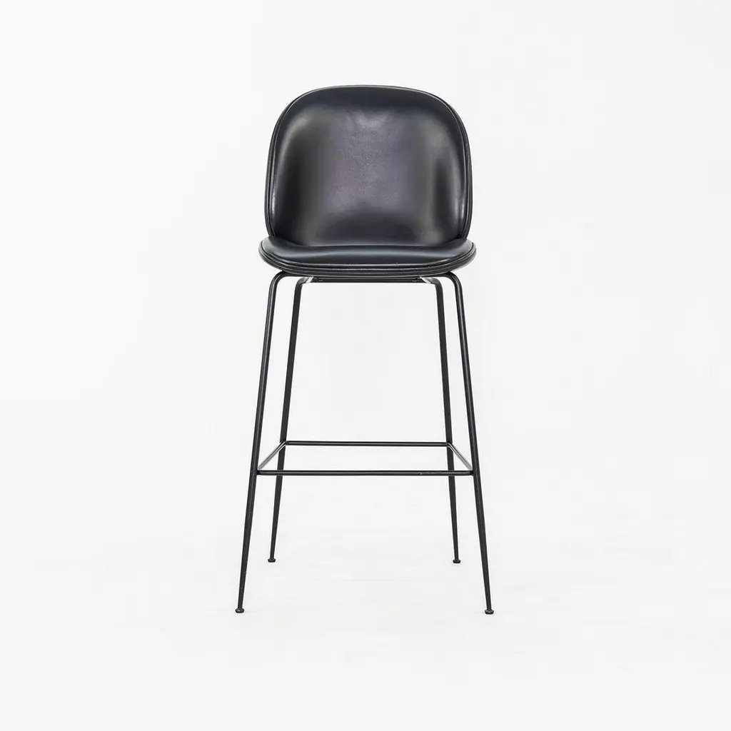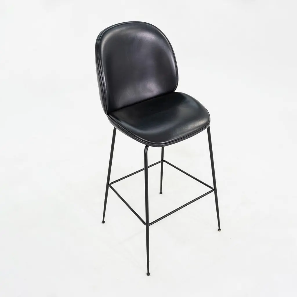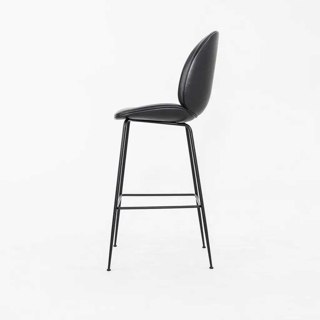 These are Beetle Bar Chairs, originally designed by GamFratesi in 2013. These particular examples were produced by Gubi in Denmark circa the 2010s. They are comprised of a steel base and have a black leather upholstered seat. The listed price includes on stool and there are eight available to purchase. Each stool measures 19.5 inches deep, 21.25 inches wide, and 46.75 inches high with a seat height of 32 inches. These pieces show some expected wear from previous use, but overall these stools are in very good to excellent used condition. Please see photos.