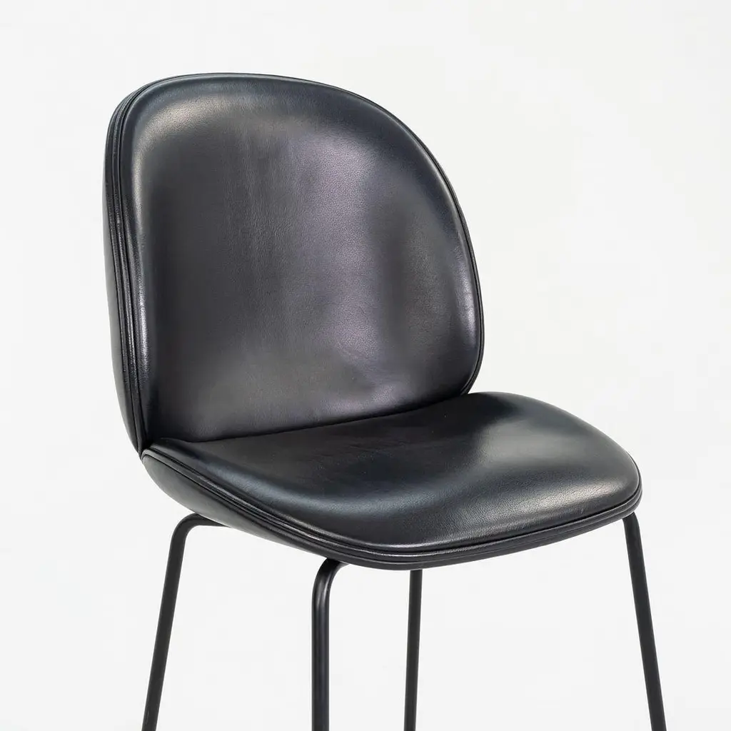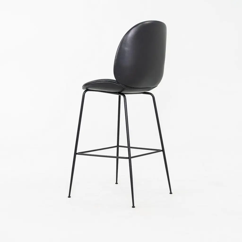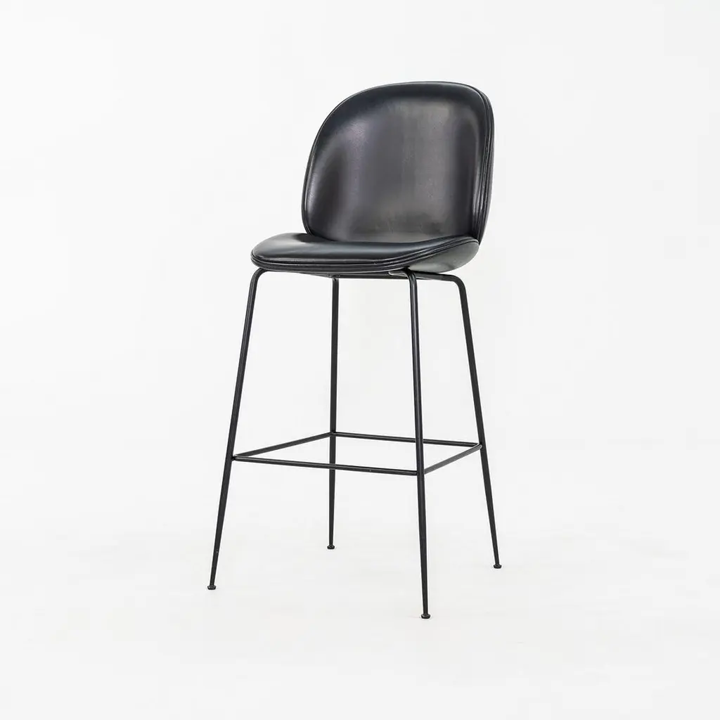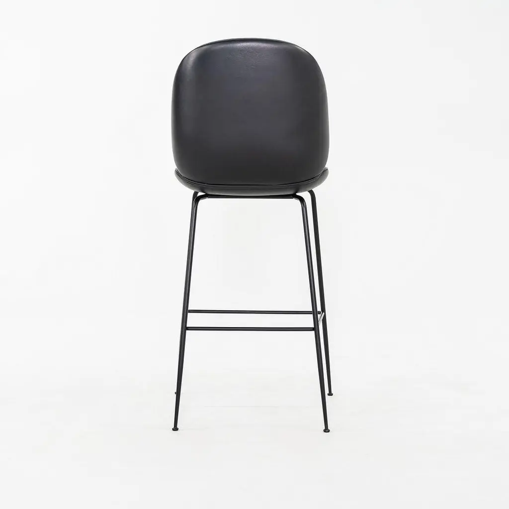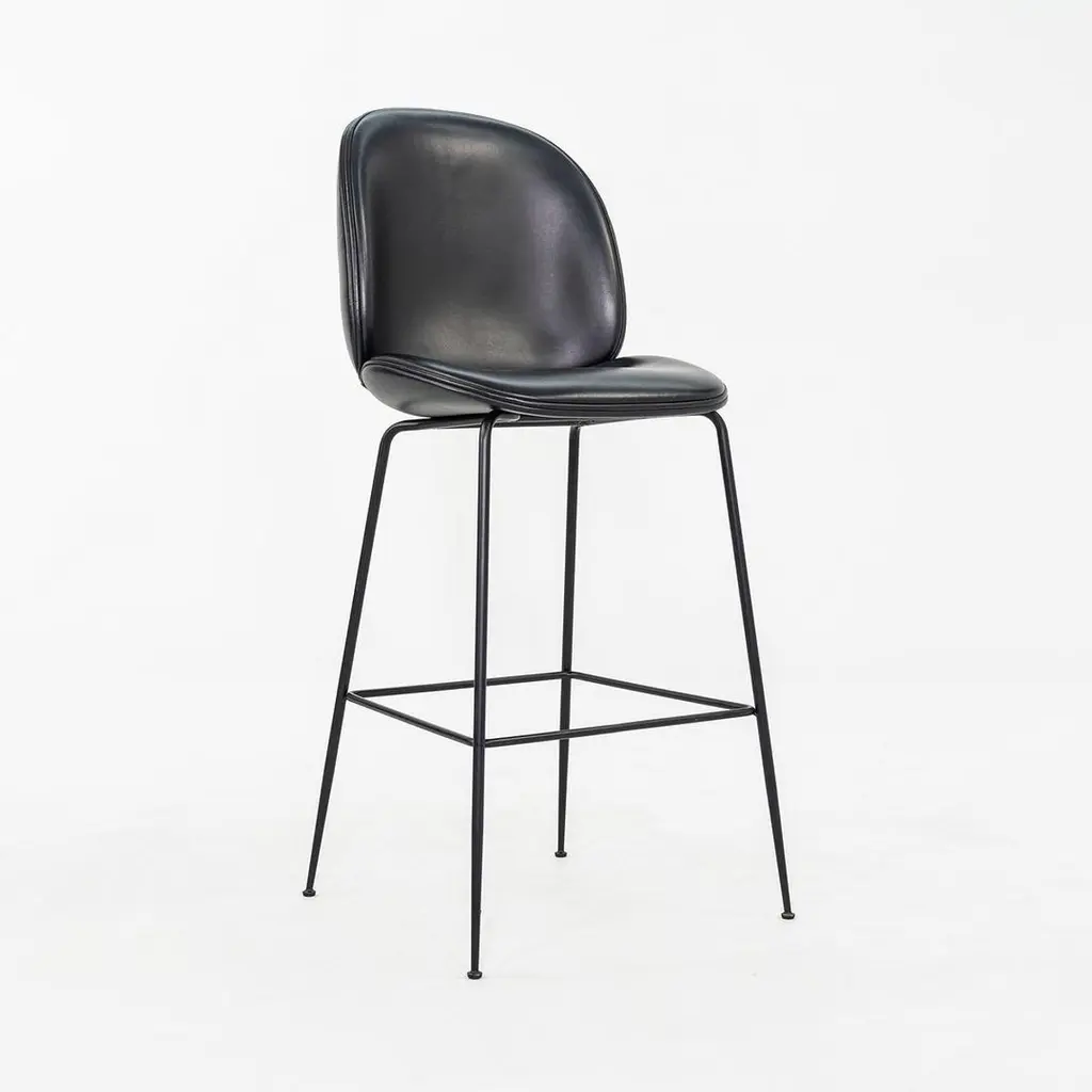 These are Beetle Bar Chairs, originally designed by GamFratesi in 2013. These particular examples were produced by Gubi in Denmark circa the 2010s. They are comprised of a steel base and have a black leather upholstered seat. The listed price includes on stool and there are eight available to purchase. Each stool measures 19.5 inches deep, 21.25 inches wide, and 46.75 inches high with a seat height of 32 inches. These pieces show some expected wear from previous use, but overall these stools are in very good to excellent used condition. Please see photos.