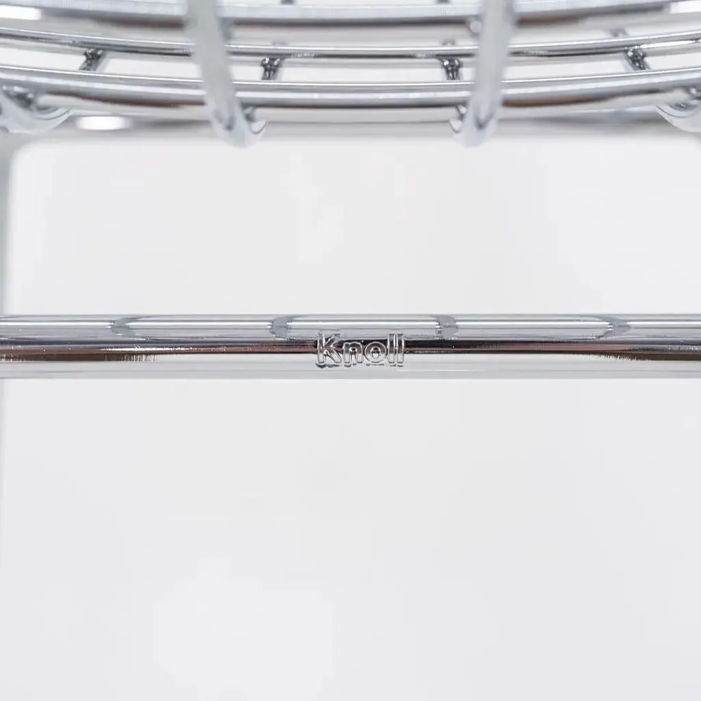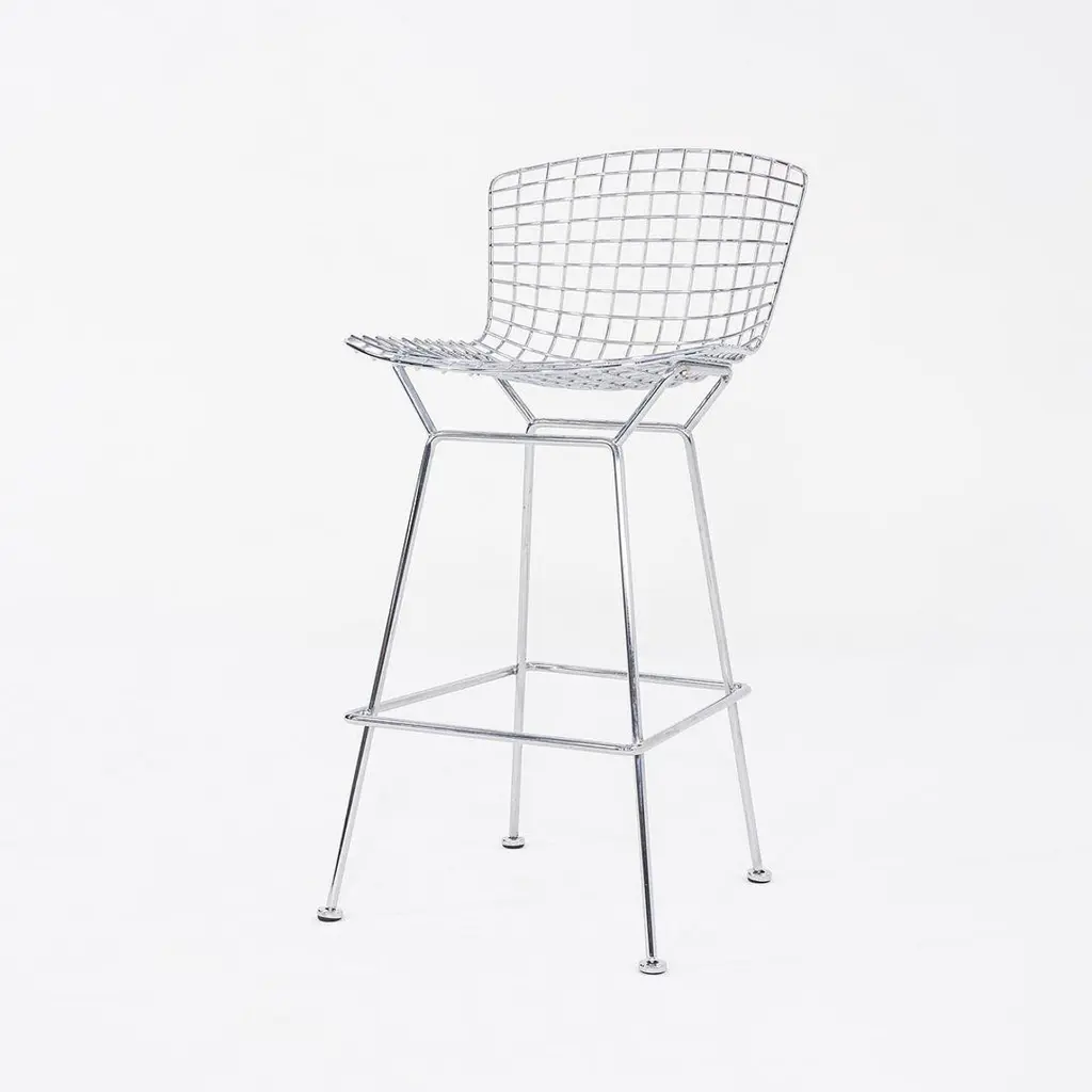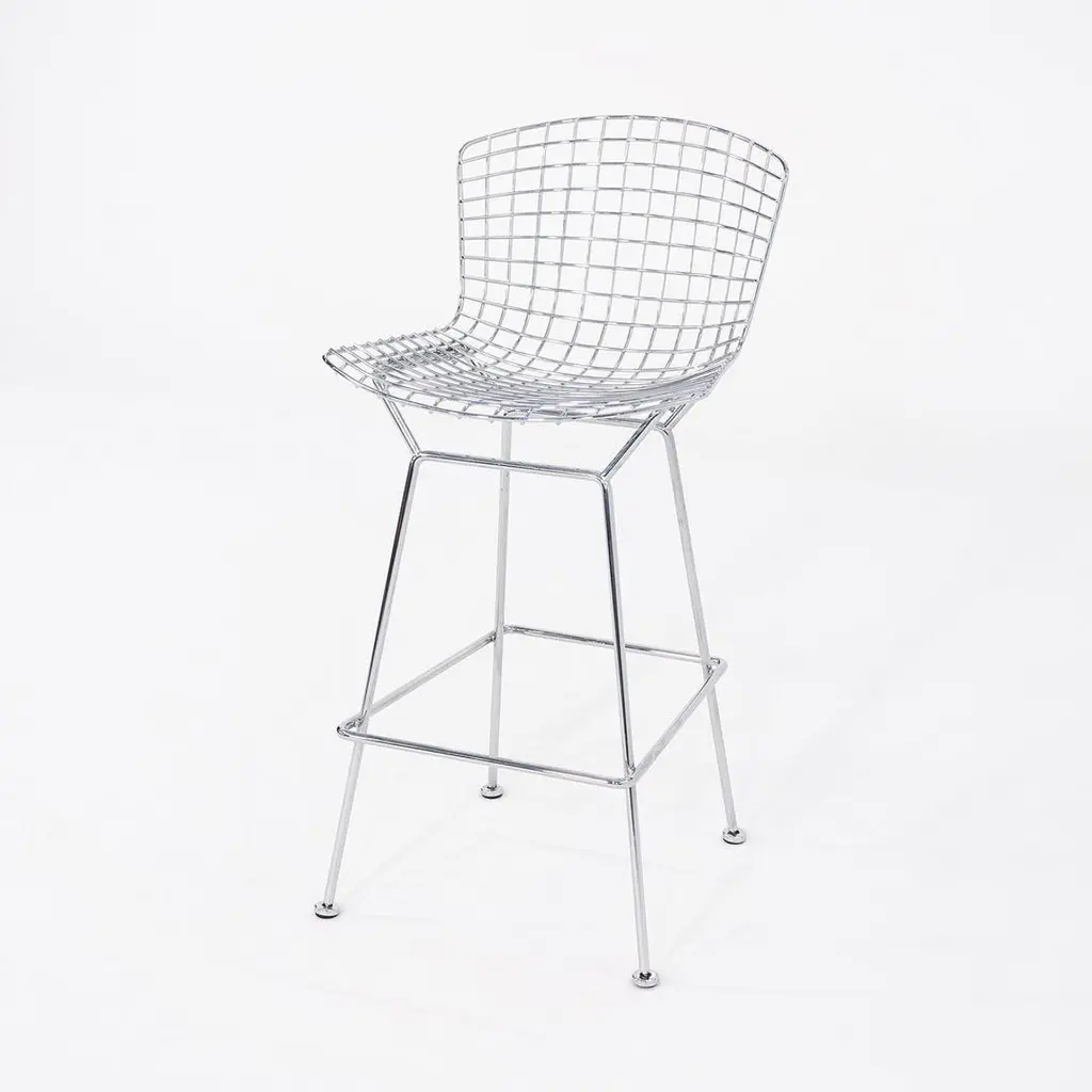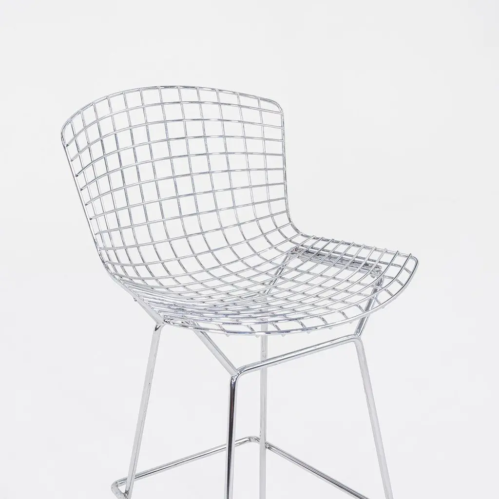 These are Bertoia Bar Stools, originally designed by Harry Bertoia in 1952. These particular examples were produced by Knoll in the 2010s. The stools are comprised of welded and chromed steel rods. The listed price includes one stool and there are four available to purchase. Each stool measures 22 inches deep, 21.75 inches wide, and 41.25 inches tall. Their seat height is 29.5 inches. The stools show minimal wear from previous use and overall are in very good to excellent condition. Please see photos