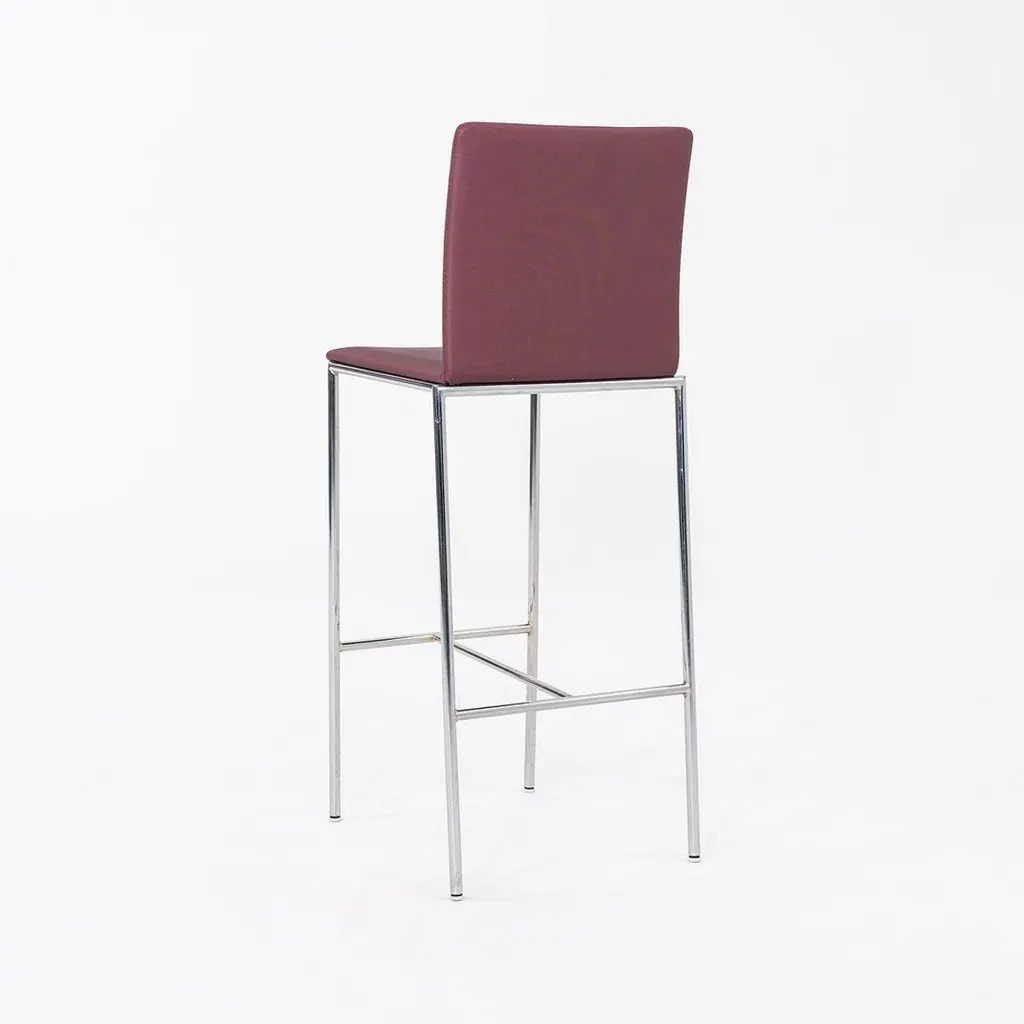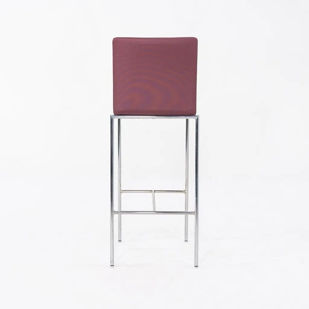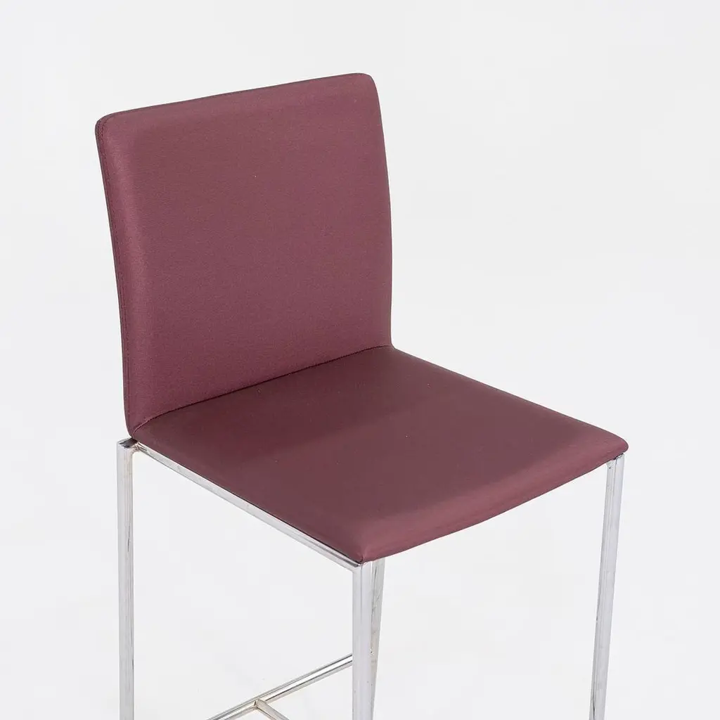This is a MilanoLight Barstool, originally designed by Wolfgang C.R. Mezger for David Furniture. These particular examples were produced in the 2010s. The stools are comprised of a steel frame and a bent plywood seat that is upholstered in a purple fabric. The listed price includes one stool and there are six available to purchase. Each stool measures 15.25 inches deep, 19.25 inches wide, and 43 inches high with a seat height of 30.25 inches. These pieces do show wear consistent with previous use, including patina on the frames and some minor stains on the fabric. Overall, the stools are in good condition. Please see photos.