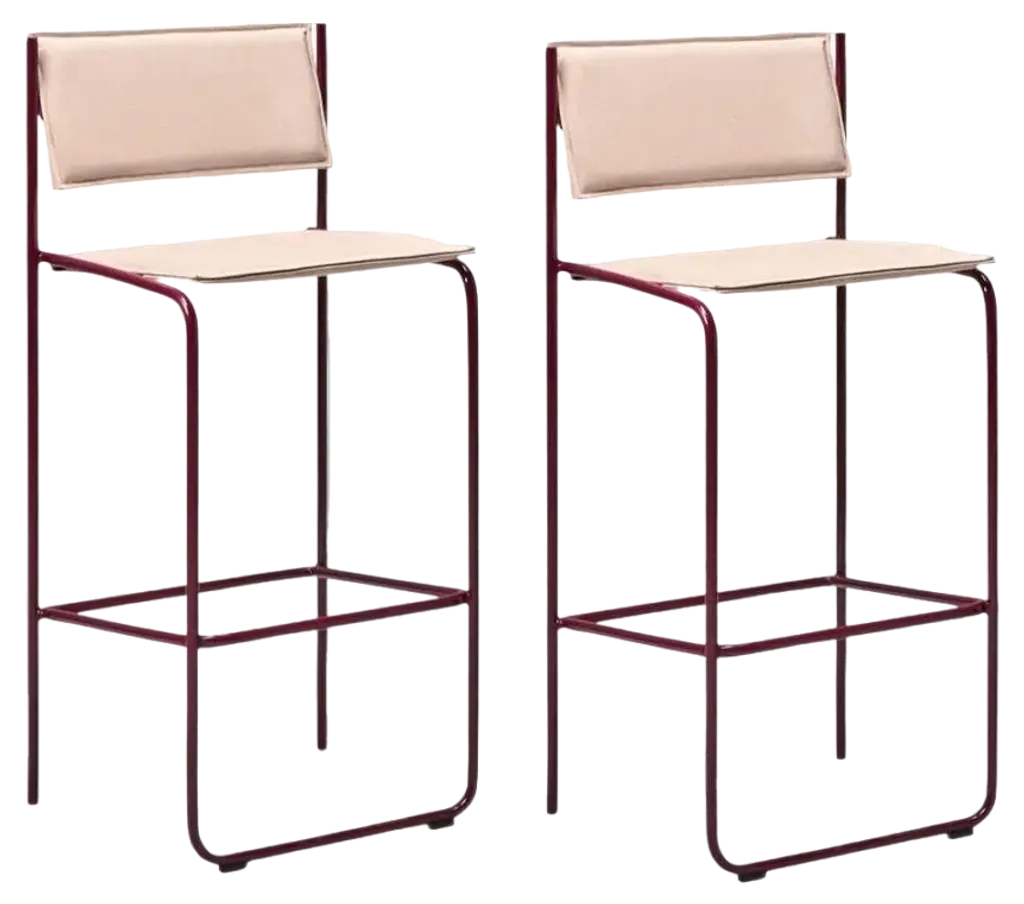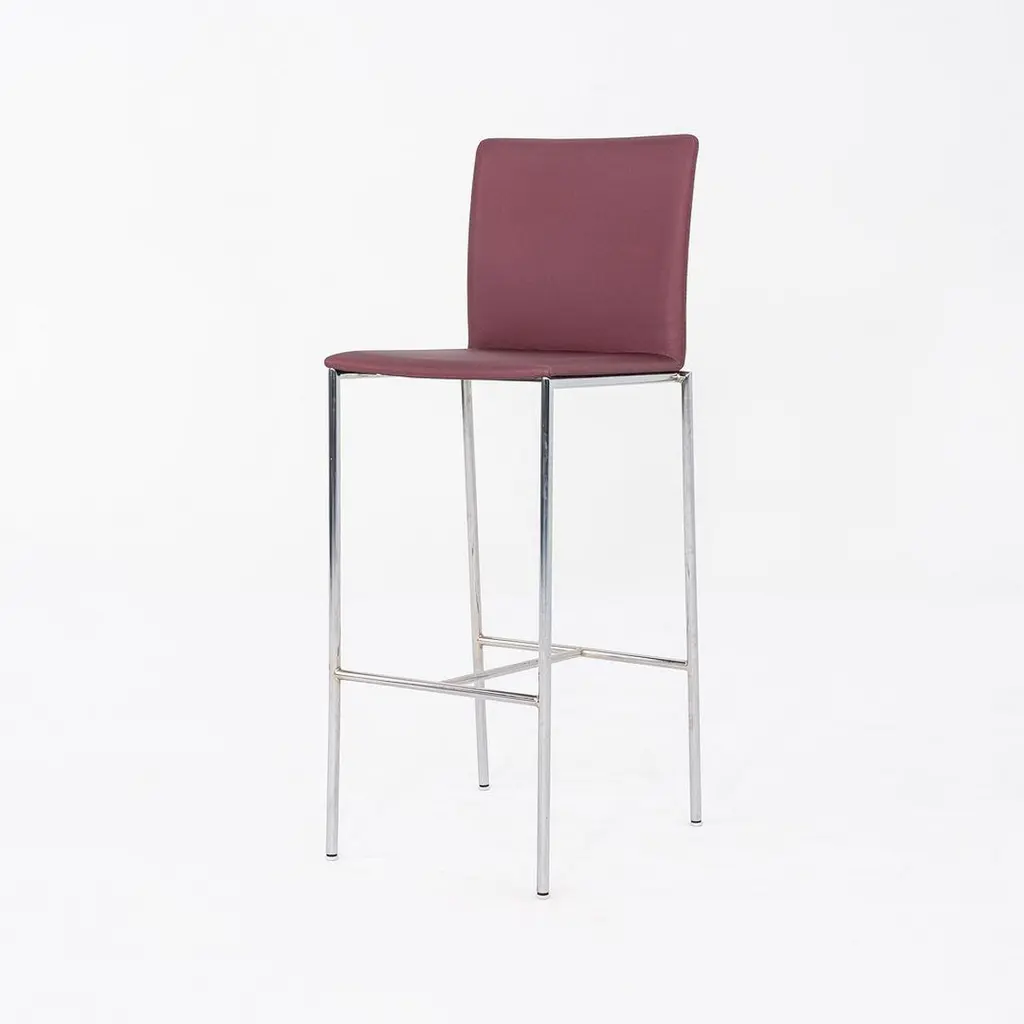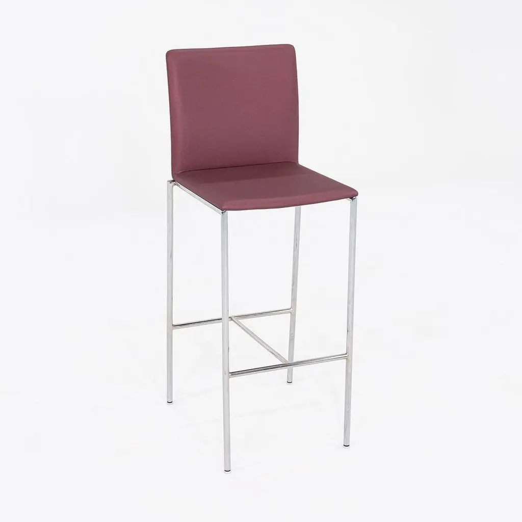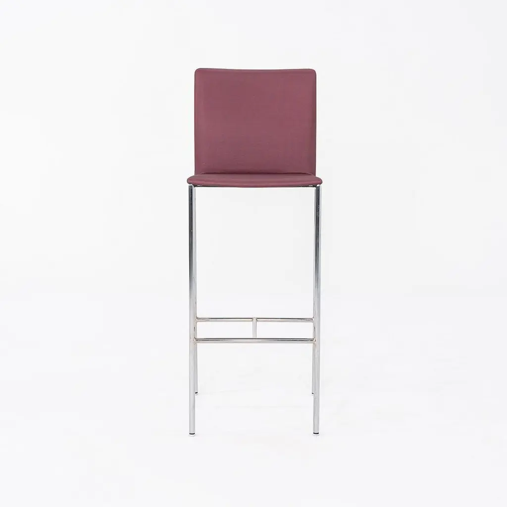 This is a MilanoLight Barstool, originally designed by Wolfgang C.R. Mezger for David Furniture. These particular examples were produced in the 2010s. The stools are comprised of a steel frame and a bent plywood seat that is upholstered in a purple fabric. The listed price includes one stool and there are six available to purchase. Each stool measures 15.25 inches deep, 19.25 inches wide, and 43 inches high with a seat height of 30.25 inches. These pieces do show wear consistent with previous use, including patina on the frames and some minor stains on the fabric. Overall, the stools are in good condition. Please see photos.