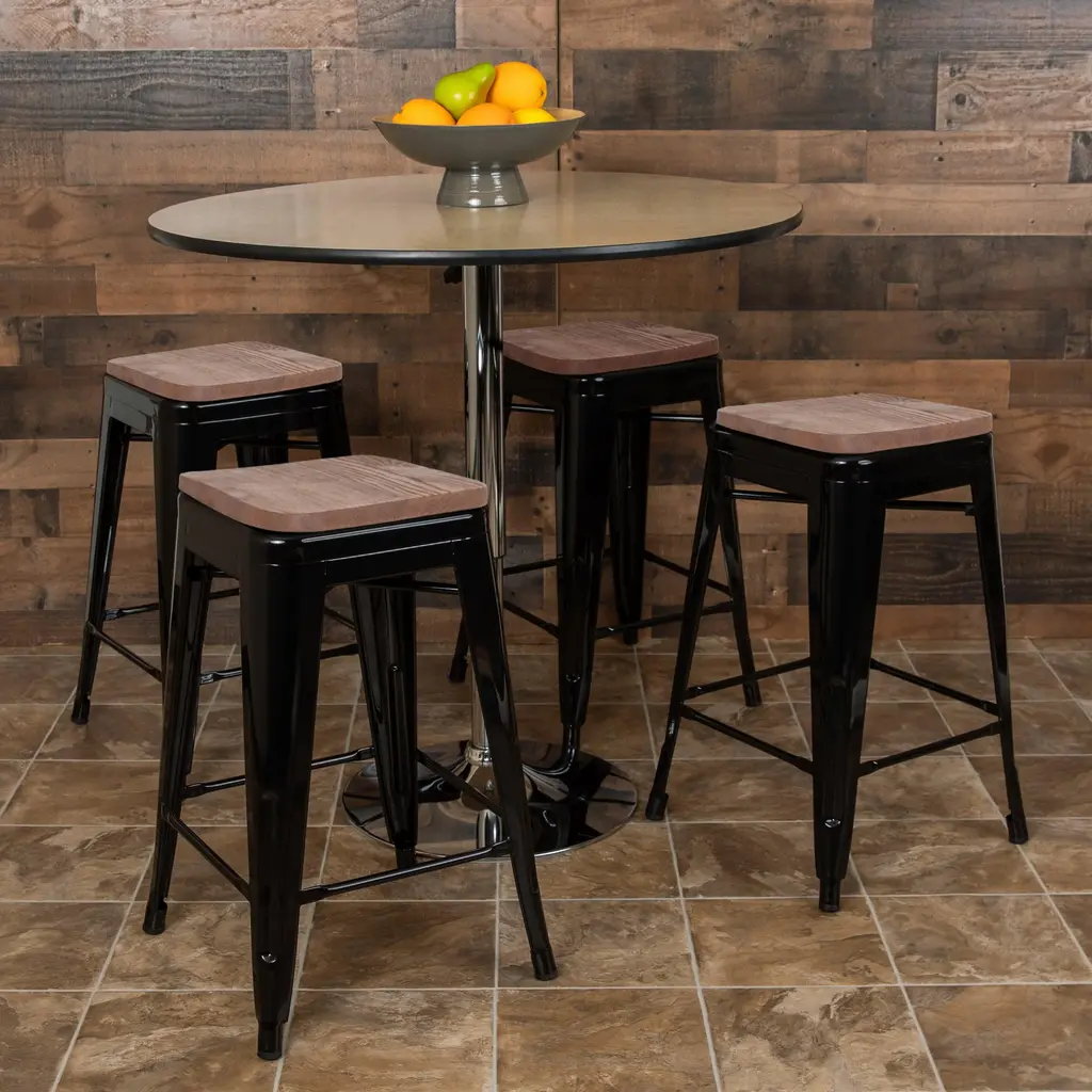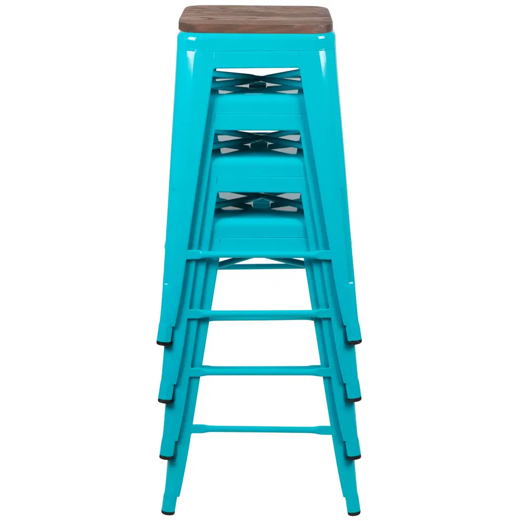 24" High Metal Counter-Height, Indoor Bar Stool With Wood Seat - Stackable Set Of 4