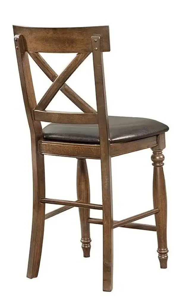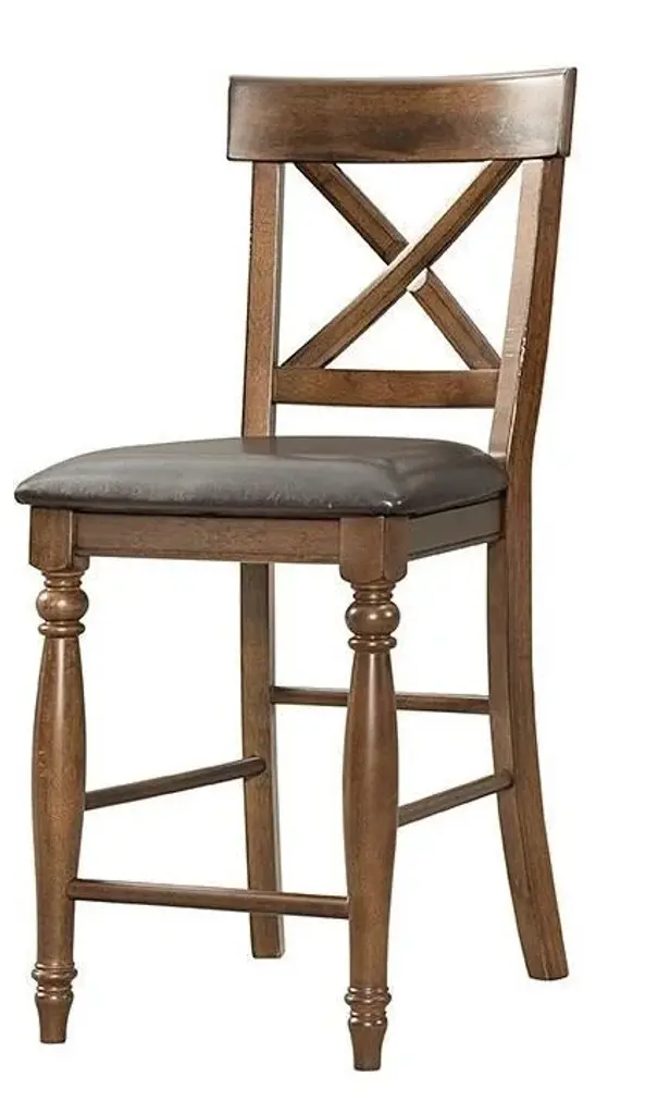 Make your dining or entertaining space complete with help from this bar stool. The piece carries a medium brown finish and features an X-back design as well as an upholstered seat and turned front legs. There will be a lot to like with this counter chair in your home decor.