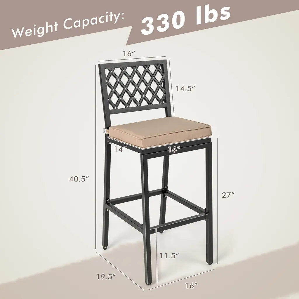 Looking for the ideal chair for your patio? Take a look at our patio bar chair set of 2! This set of chairs is designed with comfortable cushions and high rebound sponge filled interior that will give your body plenty of support. The backrest with ergonomic design fits the curves of your body, while the footrests give you an extremely comfortable sitting experience. The metal frame has a powder coating and is water and rust resistant, making it suitable for both indoor and outdoor use . In addition, thanks to the heavy-duty metal frame, each chair can provide a weight capacity of up to 330 lbs. The simple and modern design makes this set of chairs suitable for a variety of decorative styles. Whether you use it in a dining room, kitchen, balcony or poolside, it will be an ideal choice. Features:Specification