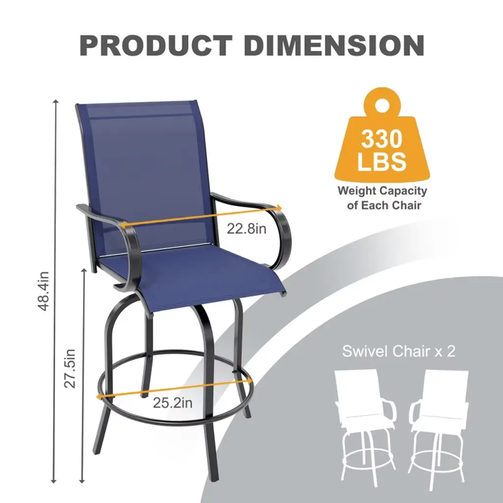 This 2-piece patio swivel bar stool set features 360° rotation, ergonomic design, and breathable, weather-resistant textilene fabric. With a 330 lb capacity, curved armrests, and footrests, it offers comfortable, durable seating ideal for both indoor and outdoor spaces.