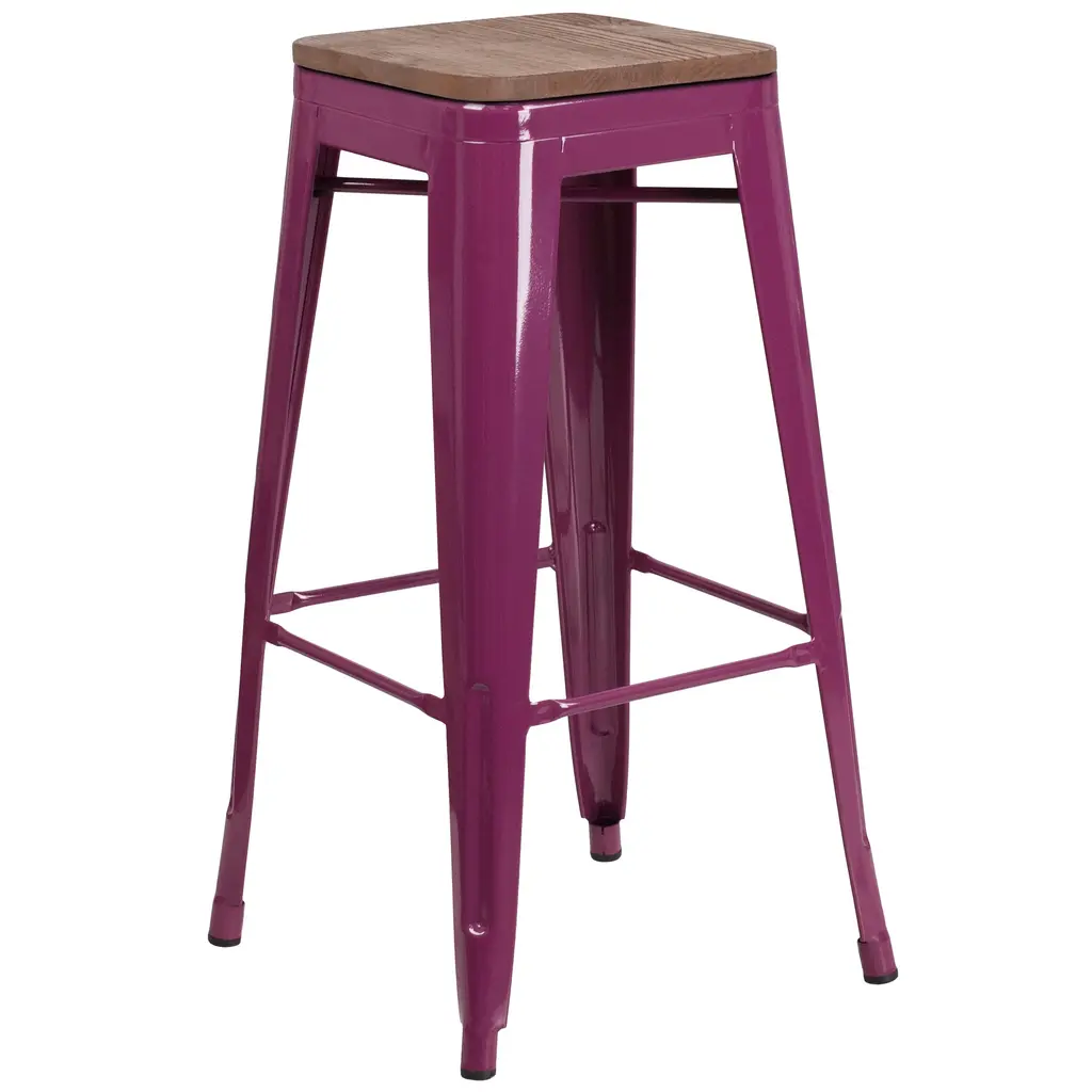 Save on space with this Backless Metal Bar Stool with wood seat. The clean lines and simple design of this square, industrial style stool will look great in your kitchen or inside your bar/restaurant.Designed to stack, this stool is an ideal choice in the restaurant industry. A cross brace underneath the seat adds extra stability and features plastic caps that prevent the finish from scratching when stacked. The lower support brace doubles as a footrest, and floor glides protect your floor by sliding smoothly when moving it.Designed for both commercial and residential use, this bar height stool will provide refreshing rustic feel with its metal and wood features.