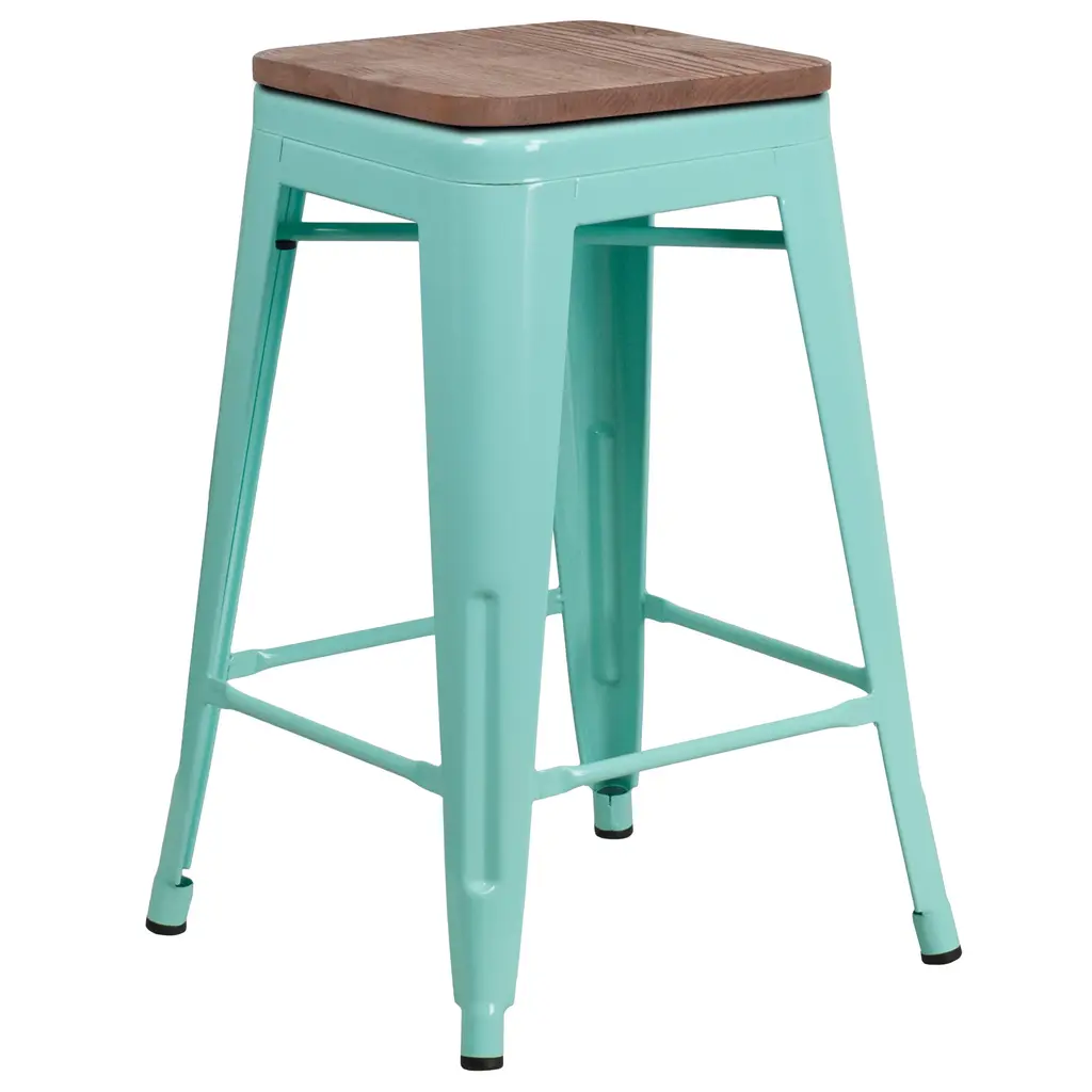 Save on space with this Backless Metal Bar Stool with wood seat. The clean lines and simple design of this square, industrial style stool will look great in your kitchen or inside your bar/restaurant.Designed to stack, this stool is an ideal choice in the restaurant industry. A cross brace underneath the seat adds extra stability and features plastic caps that prevent the finish from scratching when stacked. The lower support brace doubles as a footrest, and floor glides protect your floor by sliding smoothly when moving it.Designed for both commercial and residential use, this bar height stool will provide refreshing rustic feel with its metal and wood features.