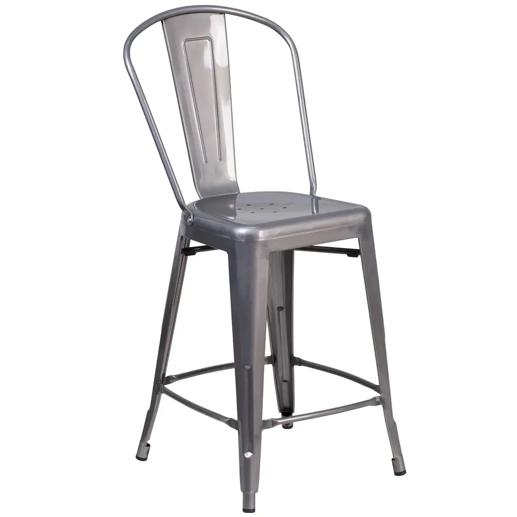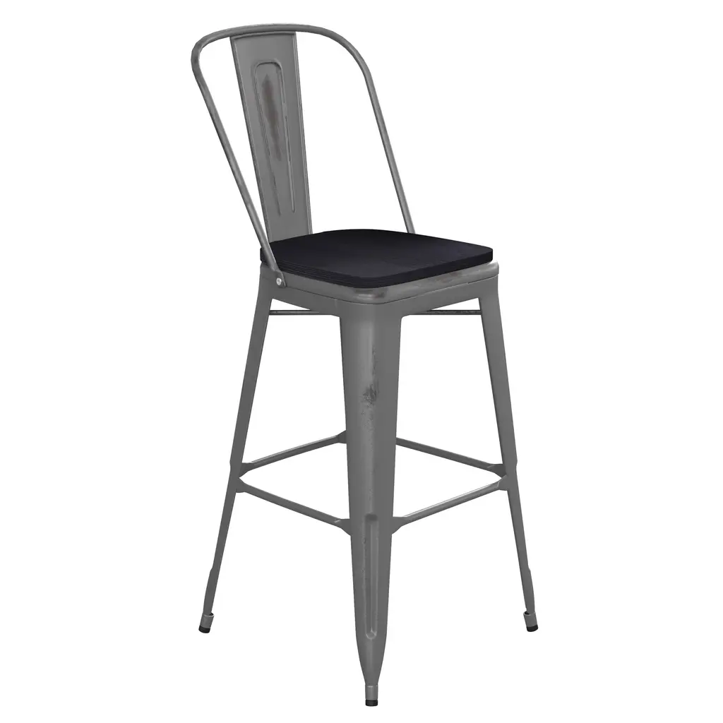 The high back, Bistro style bar stool will give your dining room or bar decor a refreshing rustic feel with its metal and wood features.This stylish metal stool features a curved back with a vertical slat and a cross brace under the seat for added support and stability. A wood seat adds comfort and beauty. The lower support brace doubles as a footrest, and the glides protect your floor by sliding smoothly when moving it.Designed for both commercial and residential use, this trend-setting setting bar height stool is a great choice for your restaurant's dining area or your home bar.