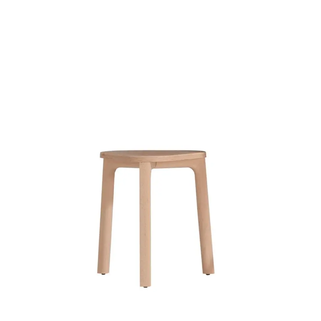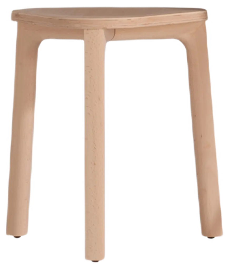 Perch, first designed in 2013, is a stool that combines curved and straight lines in a simple but carefully traced way, especially where different parts meet. It features beech wood and an upholstered seat. It is a low barstool.