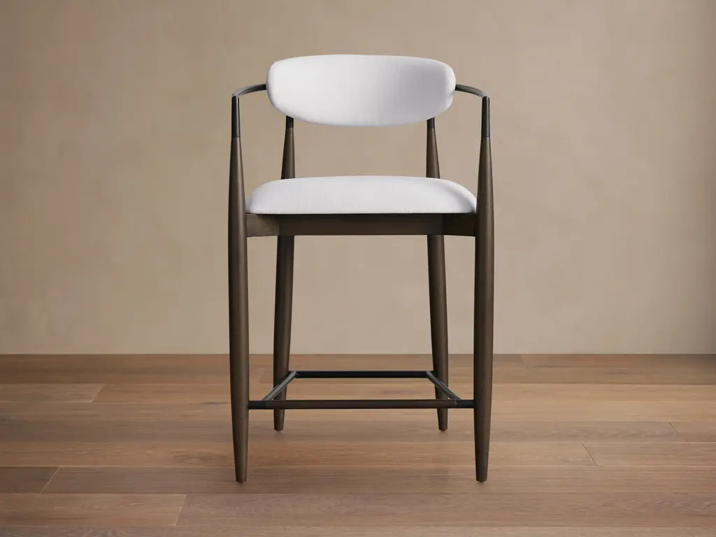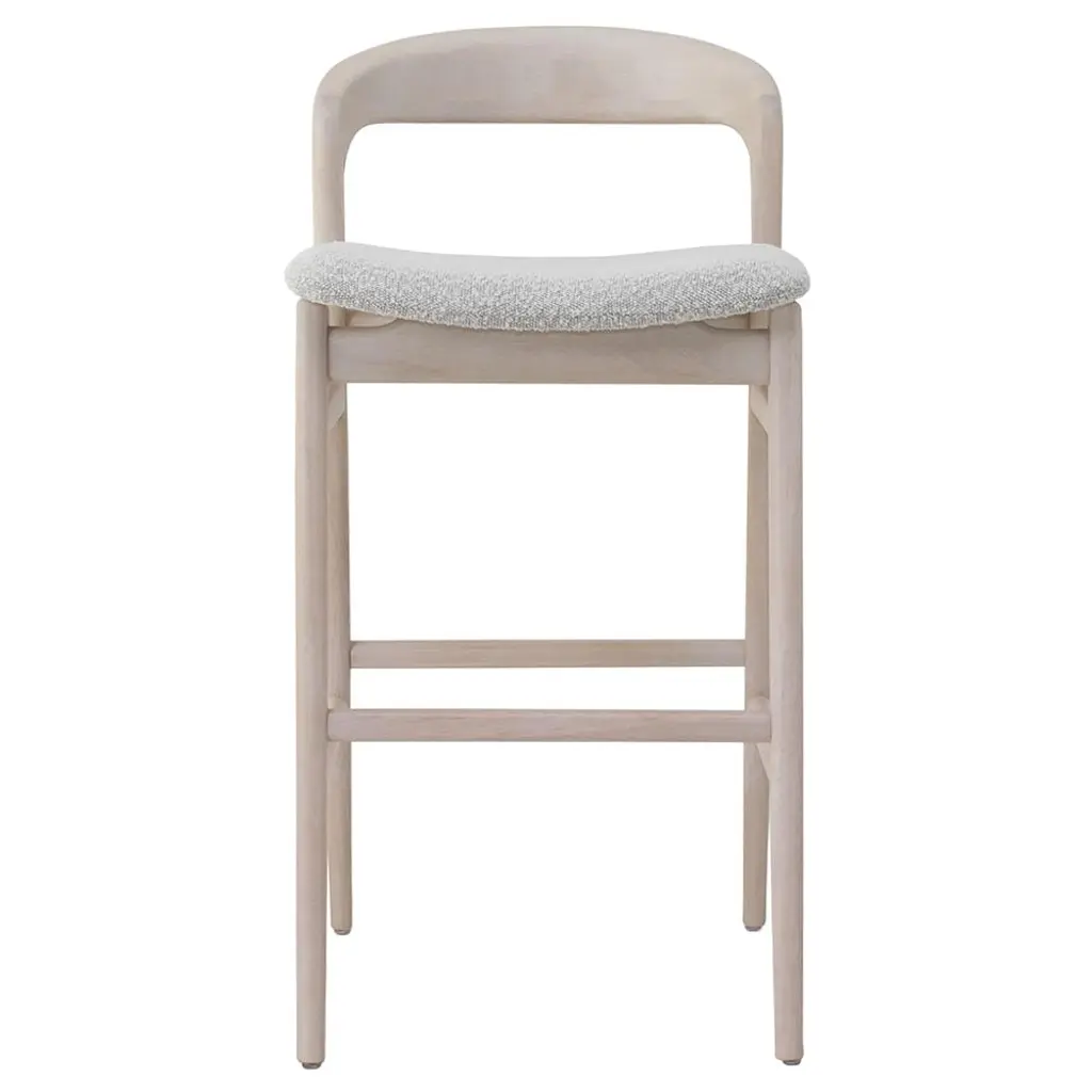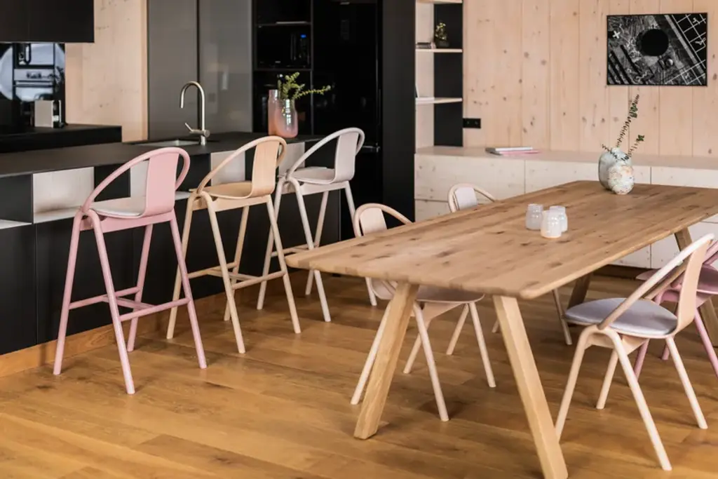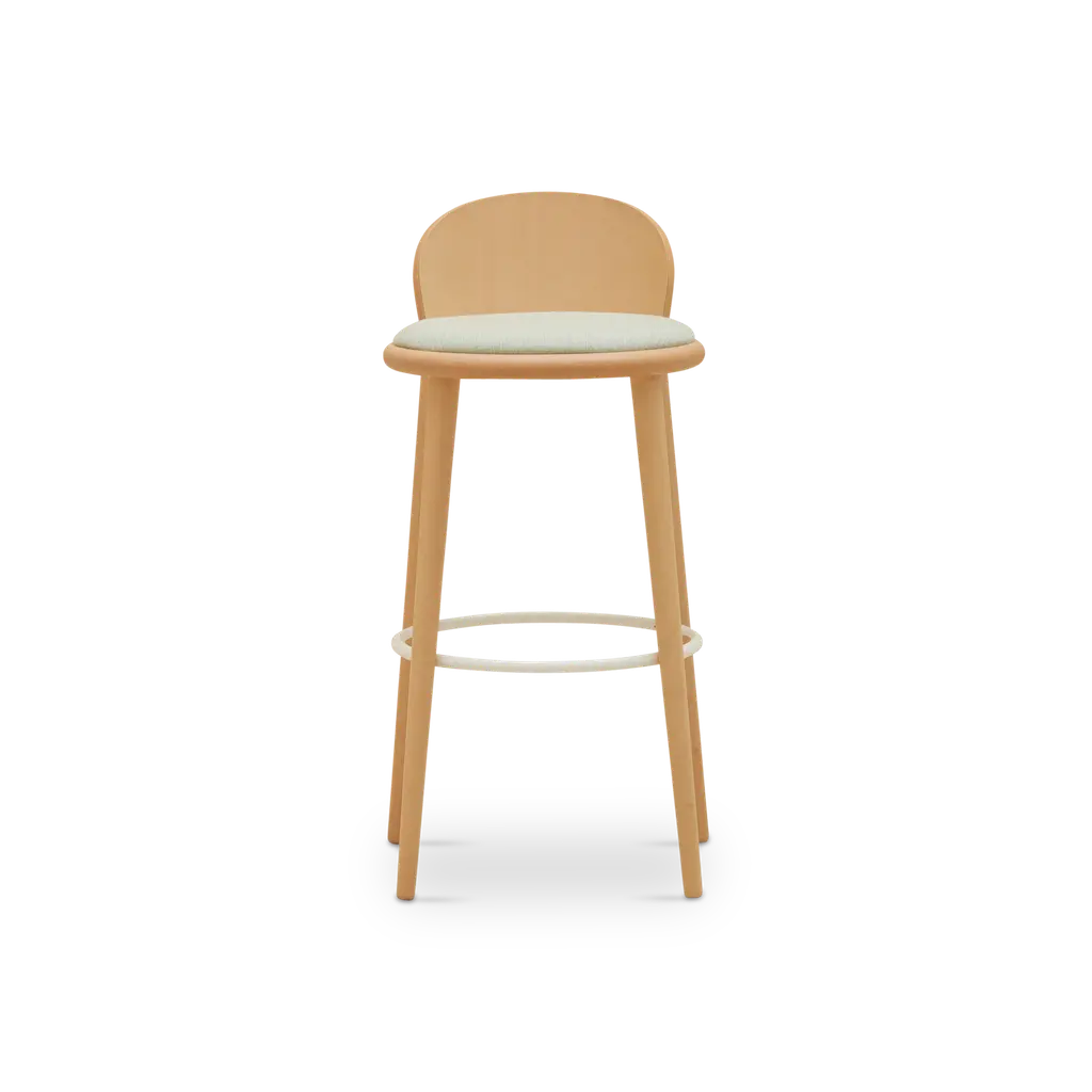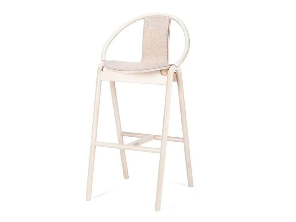 AGAIN is a wooden barstool with footrest. It has an upholstered seat. Can be covered by fabric or leather. Thanks to its longstanding collaboration with ROHI, a company creating premium wool fabrics, this year TON introduces three shades of the new upholstery fabric Milkyway. The woollen fabric portrays a shimmering Milky Way that repeats every three metres. The result is an upholstery pattern that varies slightly from chair to chair and features most effectively when used on a larger chair grouping.Stool available in two heights, wood available in different finishes. AGAIN,designed by Alex Gufler, is TON’s new collection. It is a game of wood bending – representing a swift exchange between the designer’s long-standing experience with furniture design and TON’s perfected wood working techniques. “The collection’s generous curved form, seen usually in metal furniture, presents a technical challenge when made in wood. Responding to such challenge requires significant mastery of craft to ensure that the product meets strength and durability requirements” says Gufler. In the Grand Slam design, the designer has paired TON’s trademark bent wooden rods with a visually light seat made from gently curved plywood, all with no visible joins.