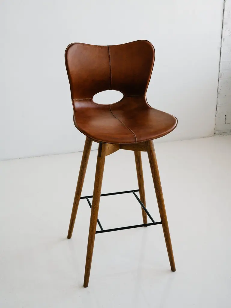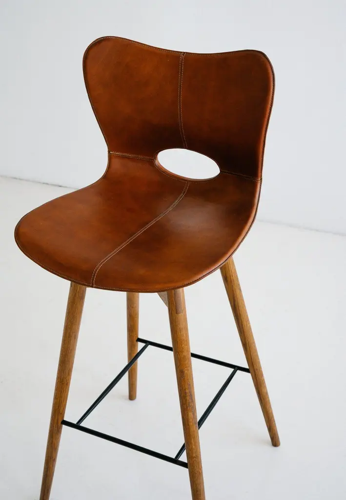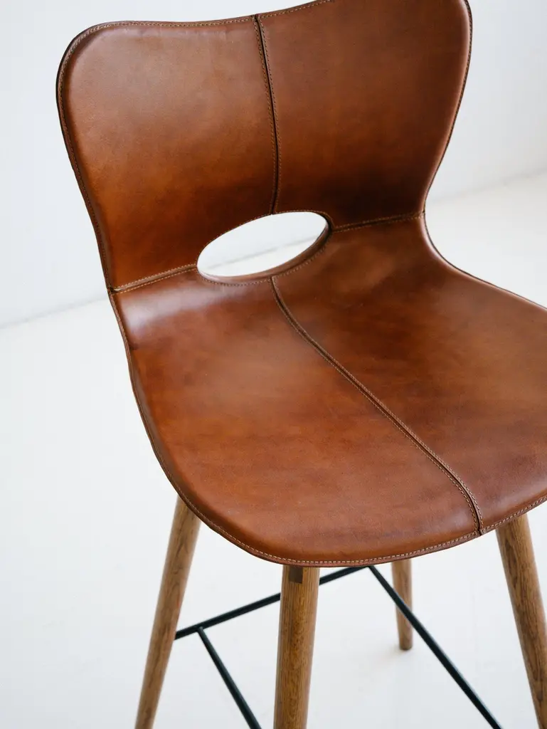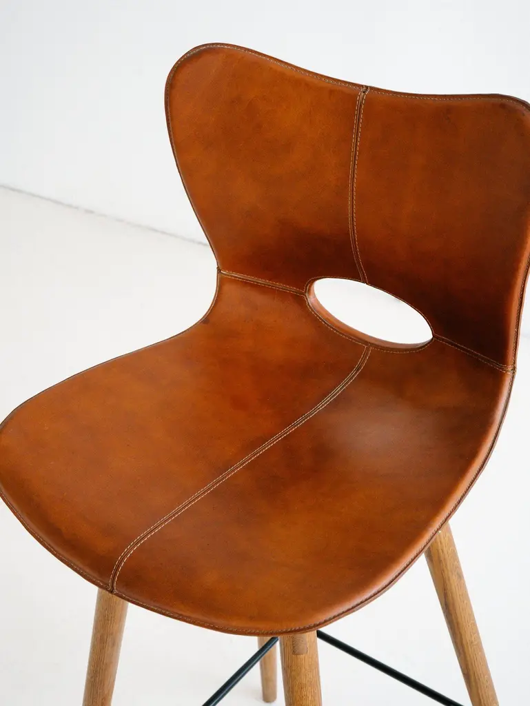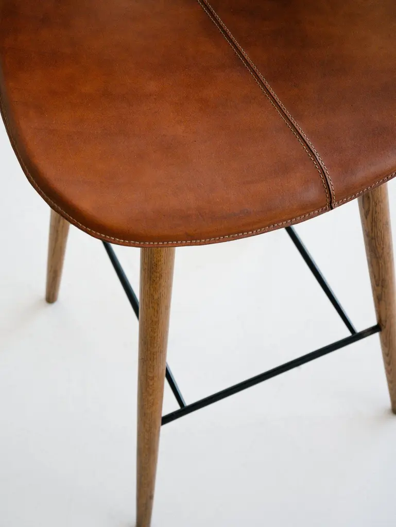 The Lariat Bar Stool is hand-stitched by traditional saddle makers in North India. The seat is top-grain saddle leather and the hardwood base is available in espresso brown or light brown. These barstools are well suited for: residential, retail display, hotel lobby and suites, and restaurant applications. Founded in 2011, AKMD developed out of a thirteen-year friendship and design collaboration between Ayush Kasliwal and Mike Dreeben.The two met in Jaipur, India in 1998: Dreeben had recently completed an MFA in sculpture at the University of Chicago and was working on a Fulbright grant, studying vernacular woodworking; Kasliwal had just completed study at the prestigious National Institute of Design in Ahmedabad, with a degree in furniture design. What they found was a mutual interest in fine craft practices and how these could inform contemporary design. This has become a driving concept behind the AKMD collection.Both Kasliwal and Dreeben are makers and their design approach begins with a deep understanding of the inherent characteristics of material and of production method — allowing process to drive design, rather than the other way around. Their work is pragmatic and honest: the materials are presented straightforwardly, as are the mechanical connections that bind the pieces together. Their furniture is notably free of veneer and plastics, that don't provide the kind durability that one can expect from solid wood, cast metal, or saddle leather And although everything they offer is meticulously crafted, their pieces are comfortable and unfussy — pieces that you can live with, that will respond positively to use and age by developing a patina that reflects their history in one's home.