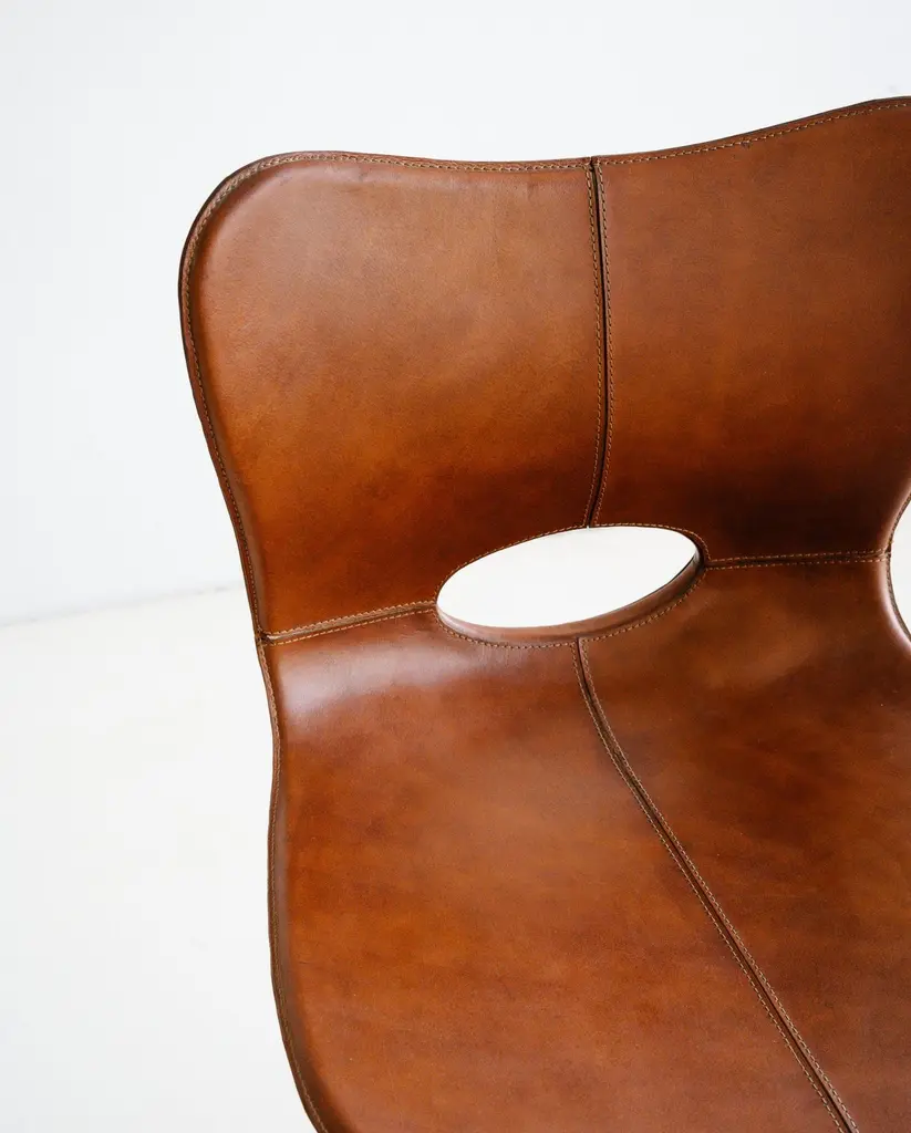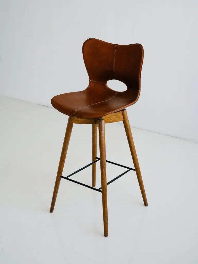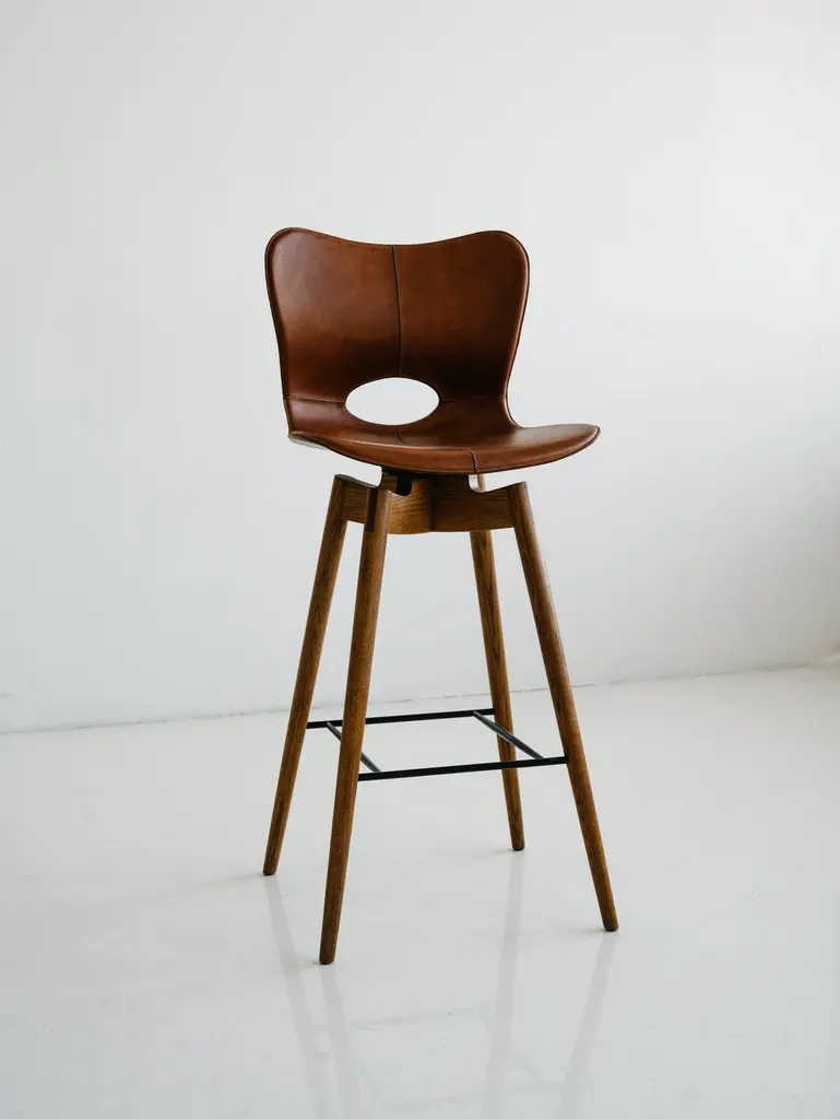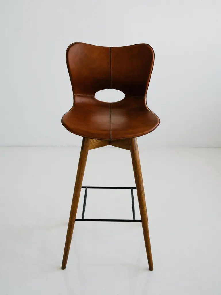 The Lariat Bar Stool is hand-stitched by traditional saddle makers in North India. The seat is top-grain saddle leather and the hardwood base is available in espresso brown or light brown. These barstools are well suited for: residential, retail display, hotel lobby and suites, and restaurant applications. Founded in 2011, AKMD developed out of a thirteen-year friendship and design collaboration between Ayush Kasliwal and Mike Dreeben.The two met in Jaipur, India in 1998: Dreeben had recently completed an MFA in sculpture at the University of Chicago and was working on a Fulbright grant, studying vernacular woodworking; Kasliwal had just completed study at the prestigious National Institute of Design in Ahmedabad, with a degree in furniture design. What they found was a mutual interest in fine craft practices and how these could inform contemporary design. This has become a driving concept behind the AKMD collection.Both Kasliwal and Dreeben are makers and their design approach begins with a deep understanding of the inherent characteristics of material and of production method — allowing process to drive design, rather than the other way around. Their work is pragmatic and honest: the materials are presented straightforwardly, as are the mechanical connections that bind the pieces together. Their furniture is notably free of veneer and plastics, that don't provide the kind durability that one can expect from solid wood, cast metal, or saddle leather And although everything they offer is meticulously crafted, their pieces are comfortable and unfussy — pieces that you can live with, that will respond positively to use and age by developing a patina that reflects their history in one's home.