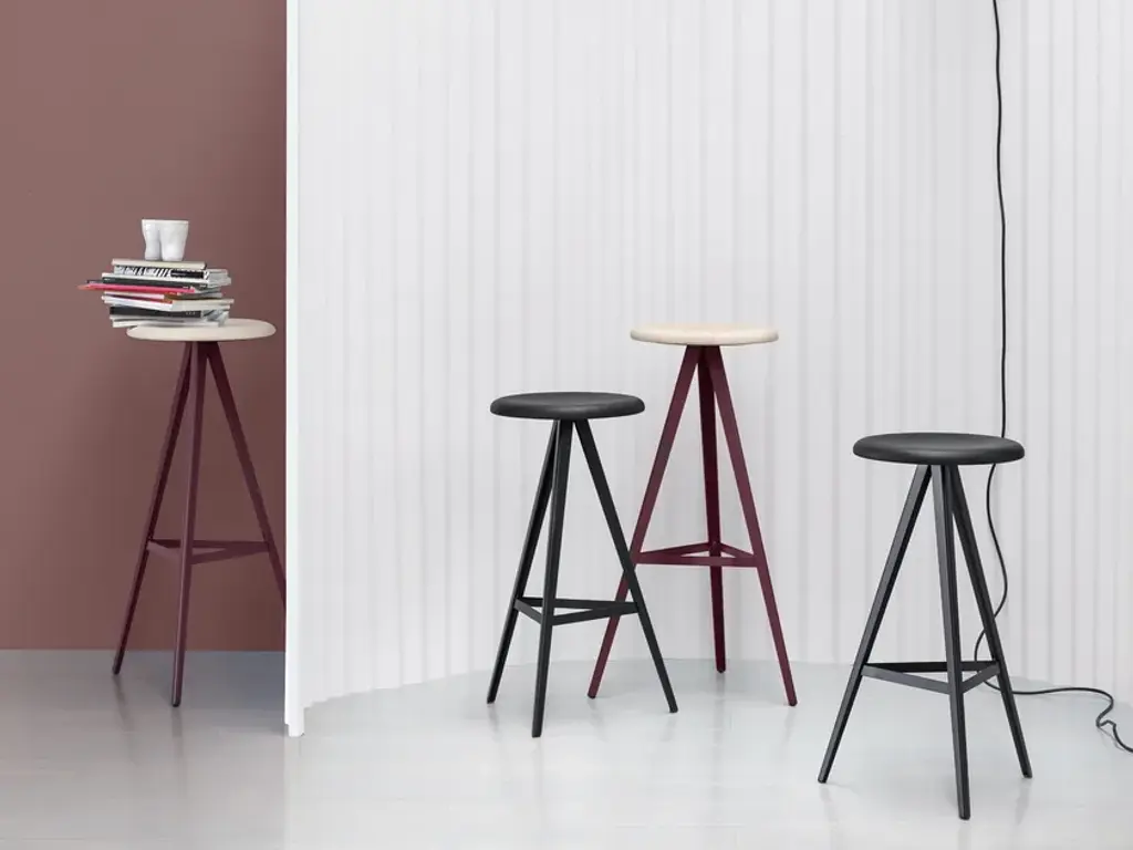 Bar stool with painted metal structure and and ash massel seat or padded fabric seat from the AKY collection, designed by Emilio Nanni.
