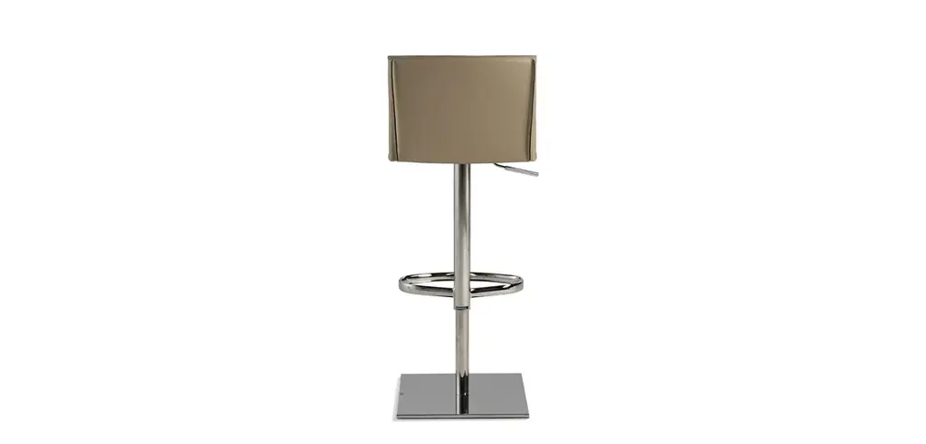 Upholstered entirely in split leather, the Alex stools feature multiple leather pieces on the back exterior, made with two lines of edge-to-edge stitching. Two versions are available: fixed or up-and-down with gas piston.
