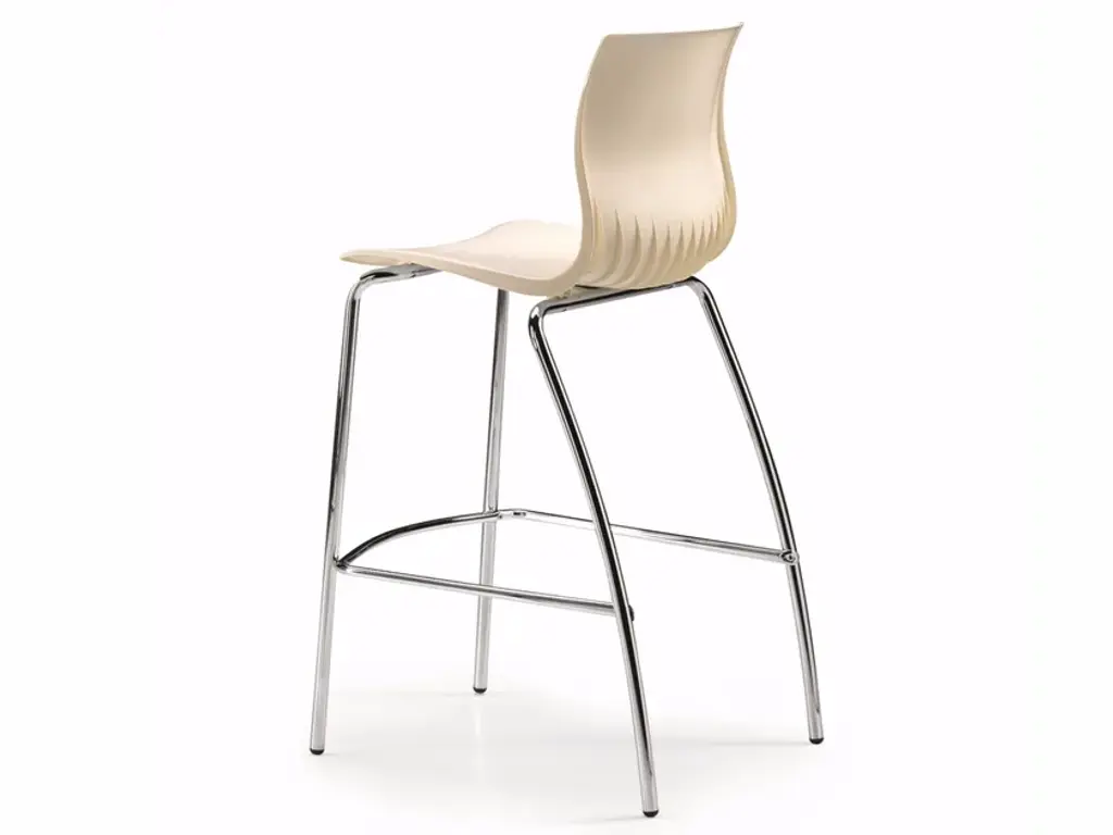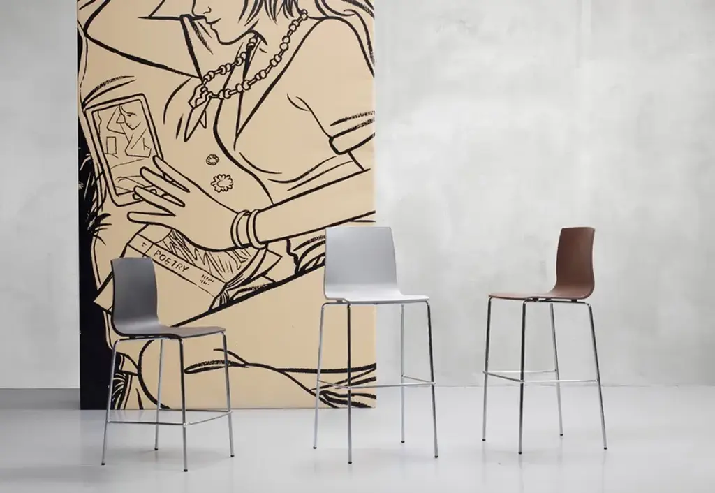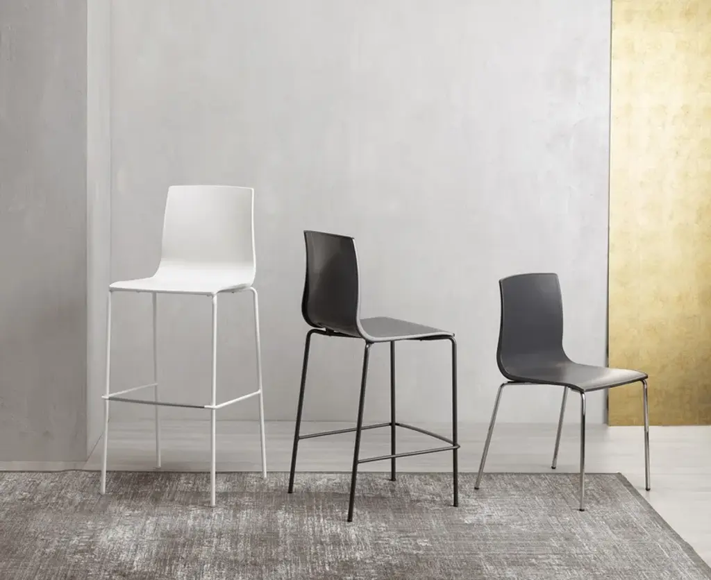 Barstool with technopolymer main body available in 5 colours. 4-leg tubular chromed steel frame .Footrest. For indoor use.PURCHASE INFORMATION : Price includes 2 pcs. with the same configuration.Alice family in technopolymer by Scab Design is characterized by a sober and elegant design, Alice fits in perfectly with the various contexts of use, whether homes, offices or collective. Its versatility is defined by the quest for a minimalist aesthetic shape, refined in the finishing details, like the continuous border on the back of the chair, the contrast between the opaque front and the glossy back and the characteristic ergonomic line, guaranteeing maximum postural comfort for the user. This product inspires “sobriety” through its design recognizable for the rigour of the highly characterizing design lines. Alice is available in several variants: with a chrome-plated or coated frame and four legs with or without arms, with chrome-plated sledge frame or as barstool in two heights. Colors available: linen, cocoa, anthracite, dove grey, light grey.