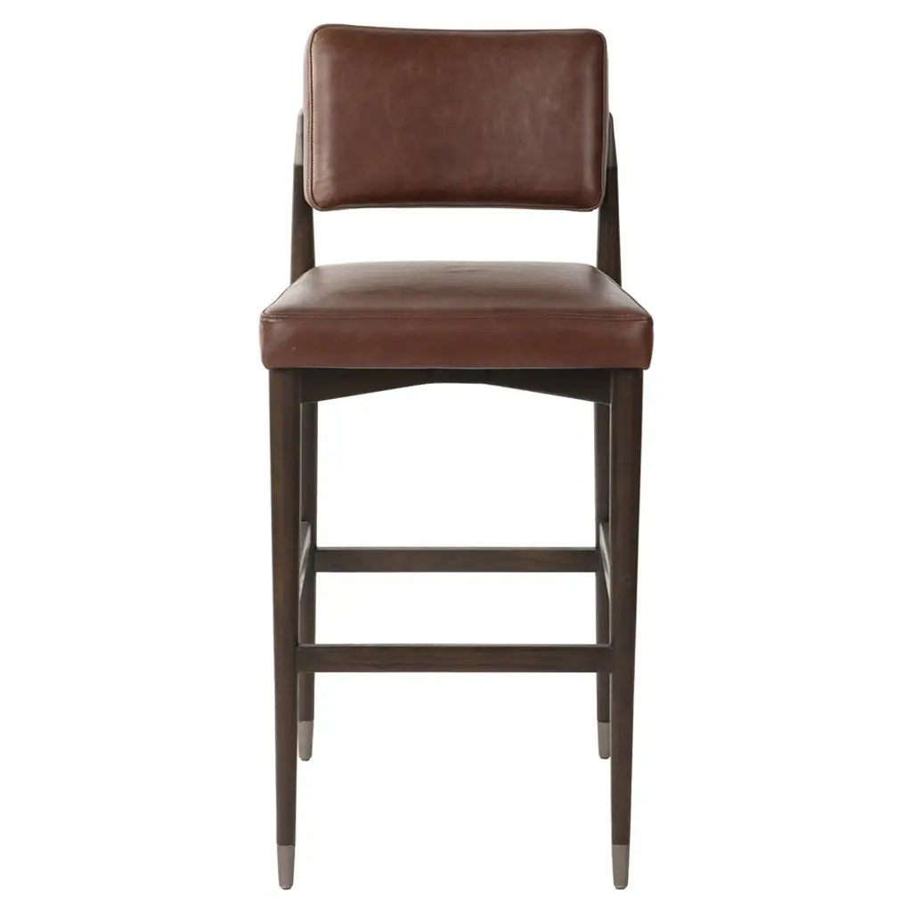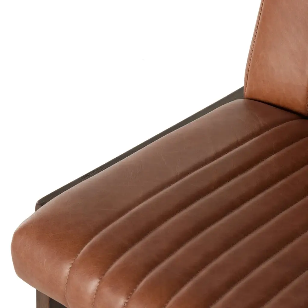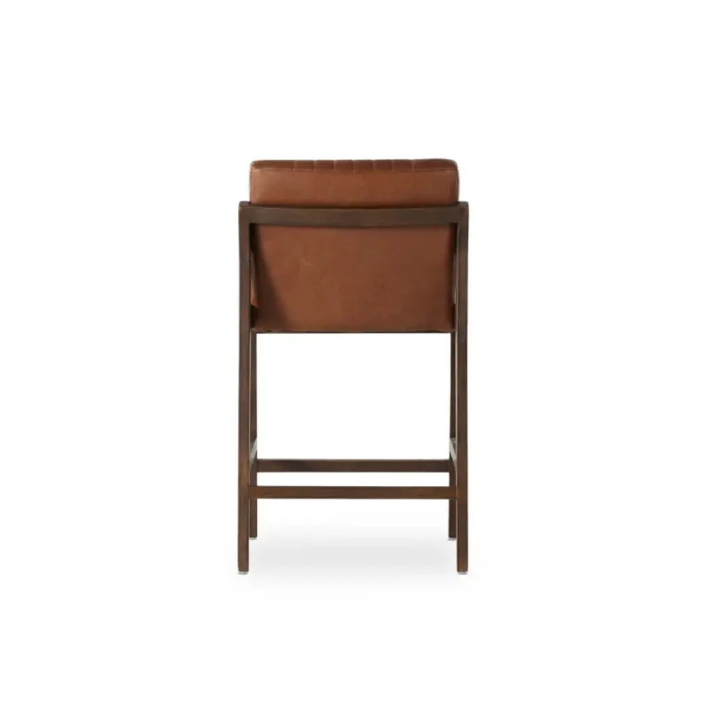 Vertical channeling and Four Hands-exclusive top-grain leather dole this Fifties-inspired bar stool new energy. Brown beech wood framing features a rear scalloped stretcher for a design-forward touch.