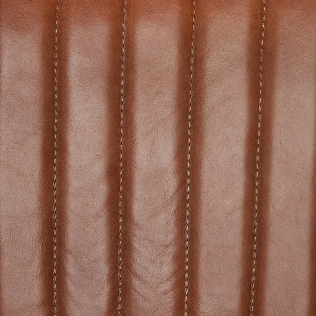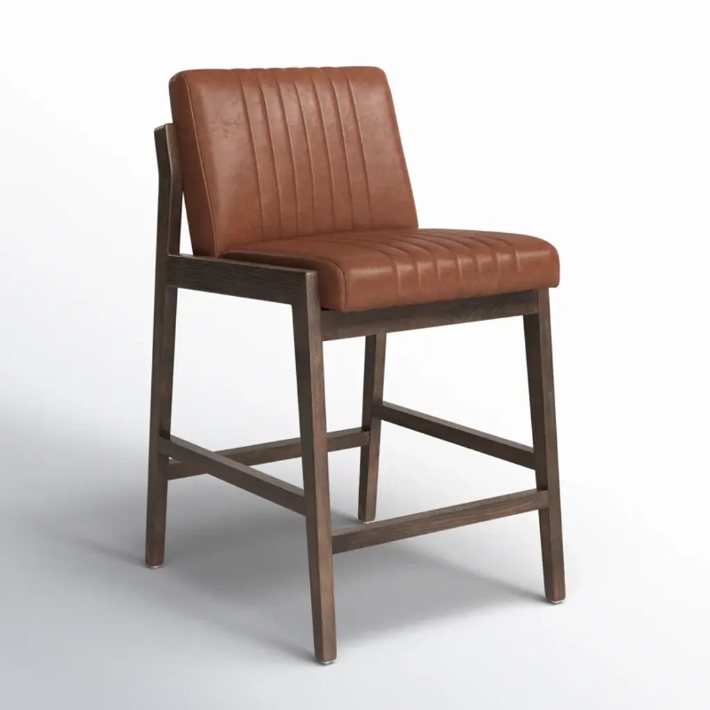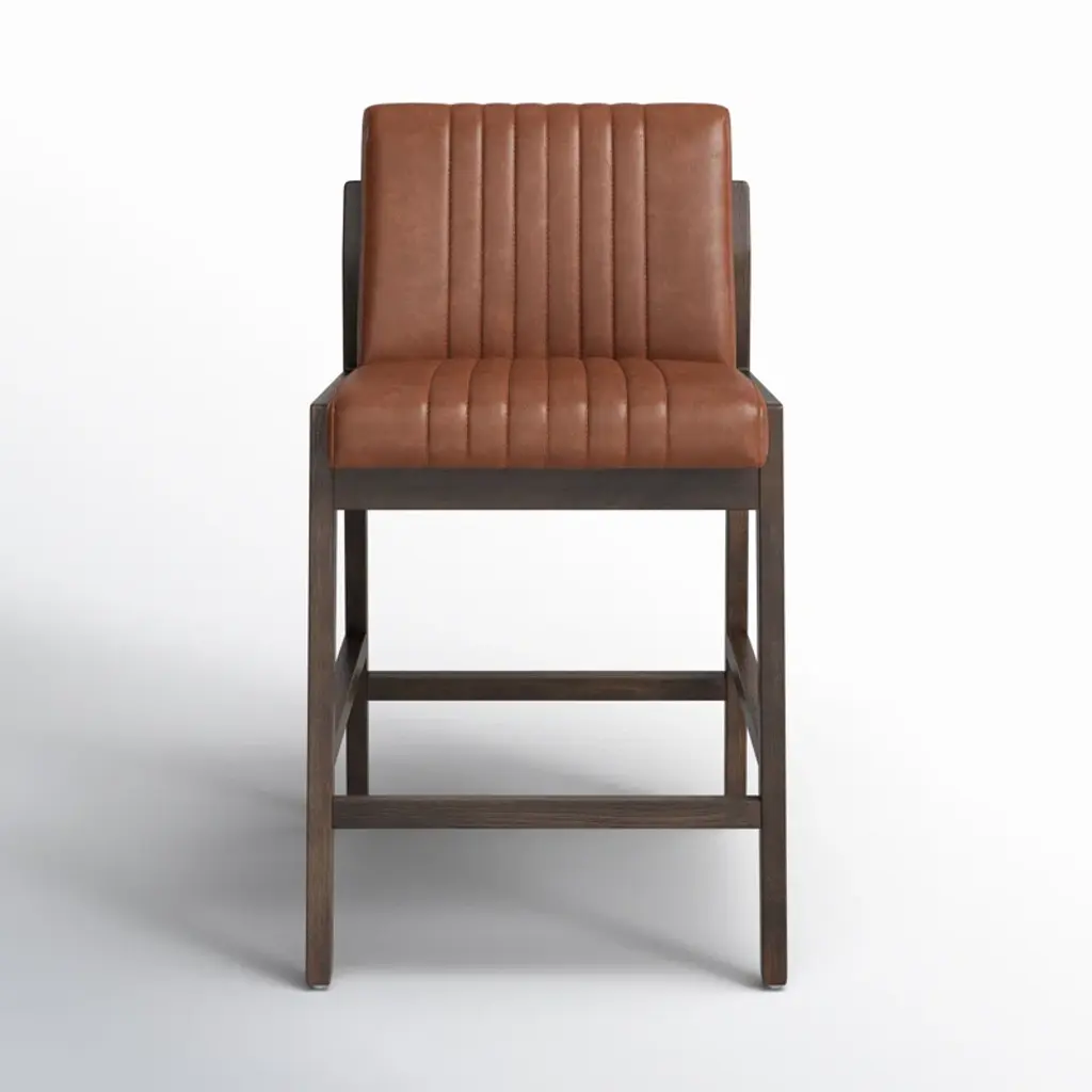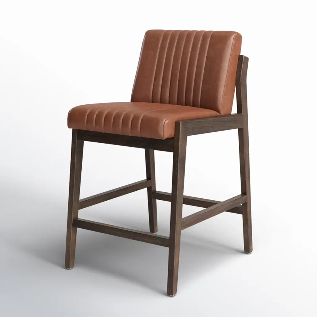 Vertical channeling and Four Hands-exclusive top-grain leather dole this Fifties-inspired bar stool new energy. Brown beech wood framing features a rear scalloped stretcher for a design-forward touch.