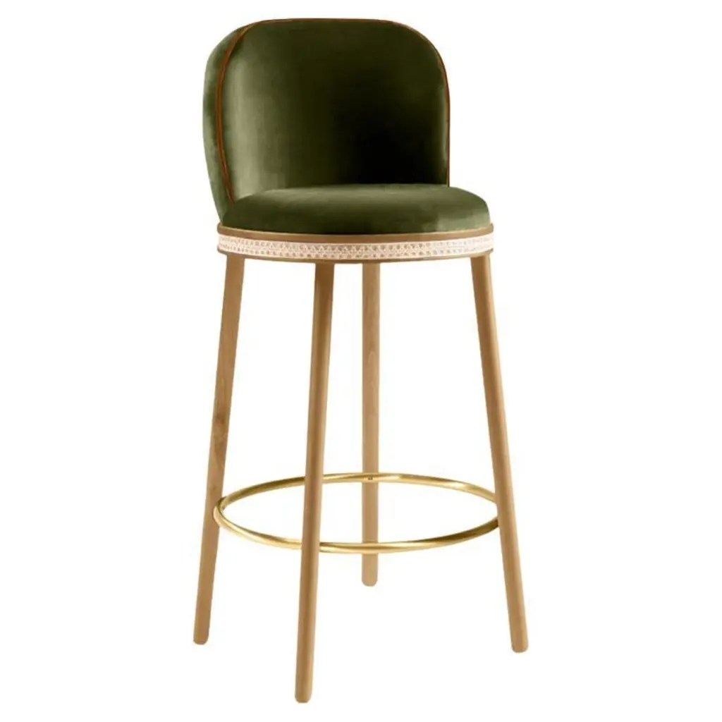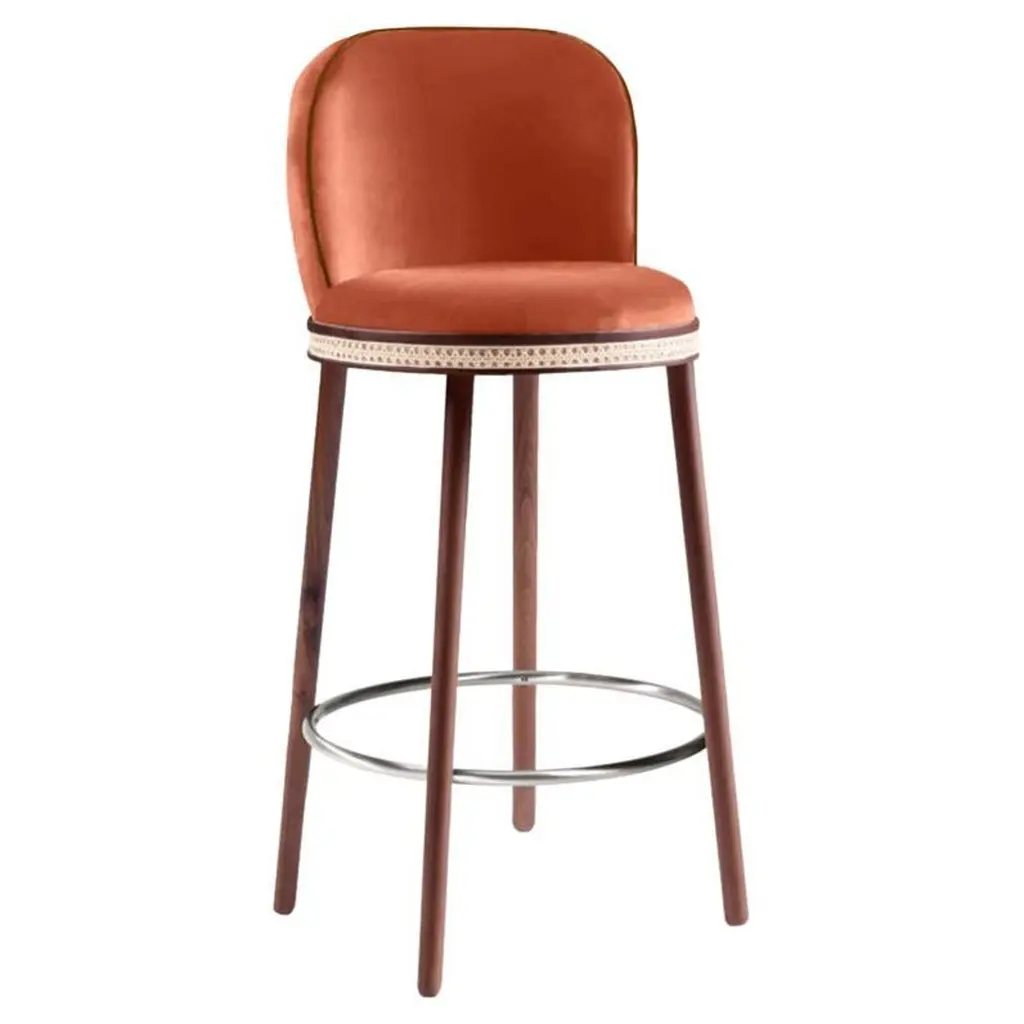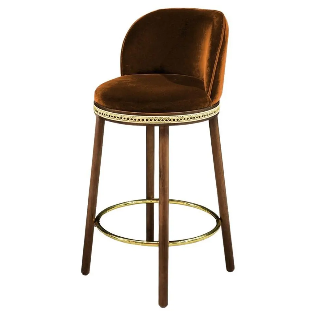 Alma counter & bar stool. As any admirer would experience gazing at its muse, it is impossible not to feel enchanted and almost hypnotized by the refined, sensual lines and the delightfully charming soul of Alma Bar Stool. In a piece that combines classic and modern aesthetics we can find a certain harmonic gracefulness paired with an intimate voluptuousness that can embrace you and surprisingly break the frontiers of sophistication and elegance.MaterialUpholstery: fabric or leatherStructure: solid wood: natural walnut and natural oakRattan: natural rattanFeaturesSeat style: roundSeat back type: sLow backWeight capacity: 400 lb.Footrest included: Yes.