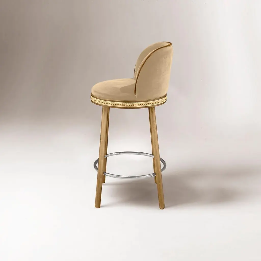 Alma counter & bar stool. As any admirer would experience gazing at its muse, it is impossible not to feel enchanted and almost hypnotized by the refined, sensual lines and the delightfully charming soul of Alma Bar Stool. In a piece that combines classic and modern aesthetics we can find a certain harmonic gracefulness paired with an intimate voluptuousness that can embrace you and surprisingly break the frontiers of sophistication and elegance.MaterialUpholstery: fabric or leatherStructure: solid wood: natural walnut and natural oakRattan: natural rattanFeaturesSeat style: roundSeat back type: sLow backWeight capacity: 400 lb.Footrest included: Yes.