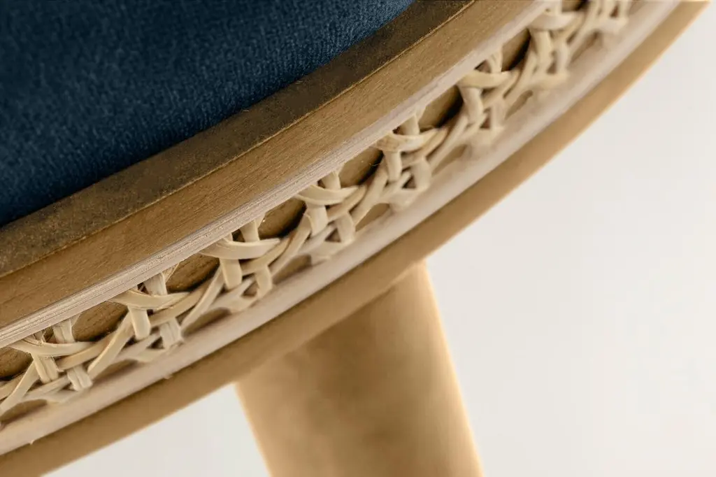 Alma counter & bar stool. As any admirer would experience gazing at its muse, it is impossible not to feel enchanted and almost hypnotized by the refined, sensual lines and the delightfully charming soul of Alma Bar Stool. In a piece that combines classic and modern aesthetics we can find a certain harmonic gracefulness paired with an intimate voluptuousness that can embrace you and surprisingly break the frontiers of sophistication and elegance.MaterialUpholstery: fabric or leatherStructure: solid wood: natural walnut and natural oakRattan: natural rattanFeaturesSeat style: roundSeat back type: sLow backWeight capacity: 400 lb.Footrest included: Yes.