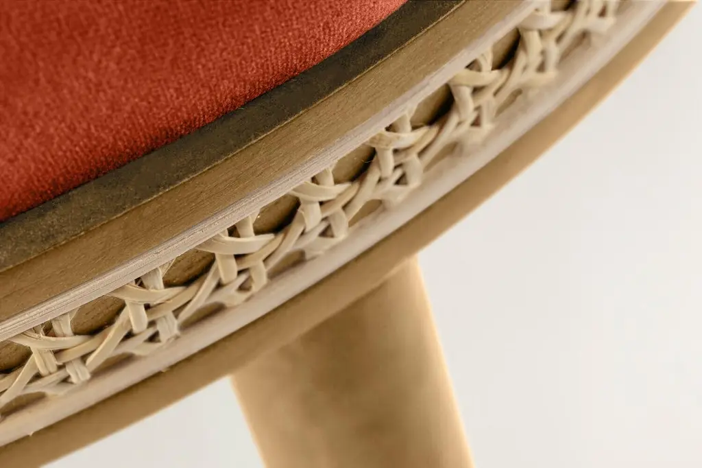 Alma counter & bar stool. As any admirer would experience gazing at its muse, it is impossible not to feel enchanted and almost hypnotized by the refined, sensual lines and the delightfully charming soul of Alma Bar Stool. In a piece that combines classic and modern aesthetics we can find a certain harmonic gracefulness paired with an intimate voluptuousness that can embrace you and surprisingly break the frontiers of sophistication and elegance.MaterialUpholstery: fabric or leatherStructure: solid wood: natural walnut and natural oakRattan: natural rattanFeaturesSeat style: roundSeat back type: sLow backWeight capacity: 400 lb.Footrest included: Yes.