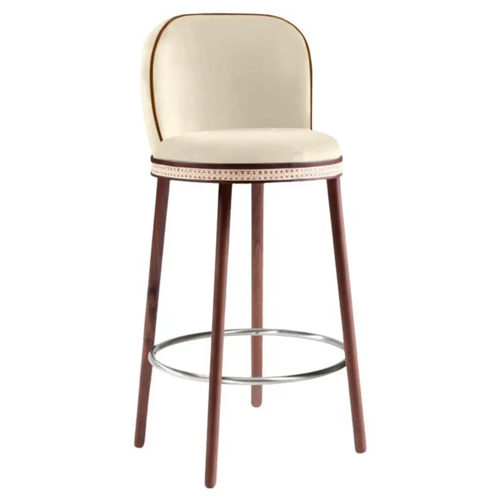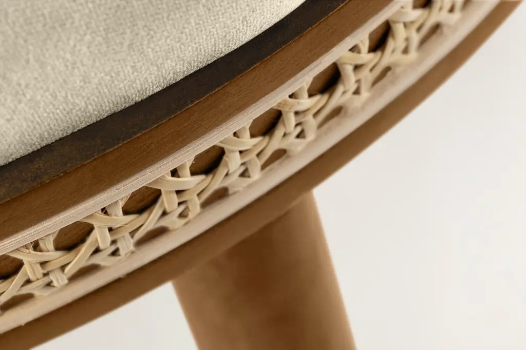 Alma counter & bar stool. As any admirer would experience gazing at its muse, it is impossible not to feel enchanted and almost hypnotized by the refined, sensual lines and the delightfully charming soul of Alma Bar Stool. In a piece that combines classic and modern aesthetics we can find a certain harmonic gracefulness paired with an intimate voluptuousness that can embrace you and surprisingly break the frontiers of sophistication and elegance.MaterialUpholstery: fabric or leatherStructure: solid wood: natural walnut and natural oakRattan: natural rattanFeaturesSeat style: roundSeat back type: sLow backWeight capacity: 400 lb.Footrest included: Yes.