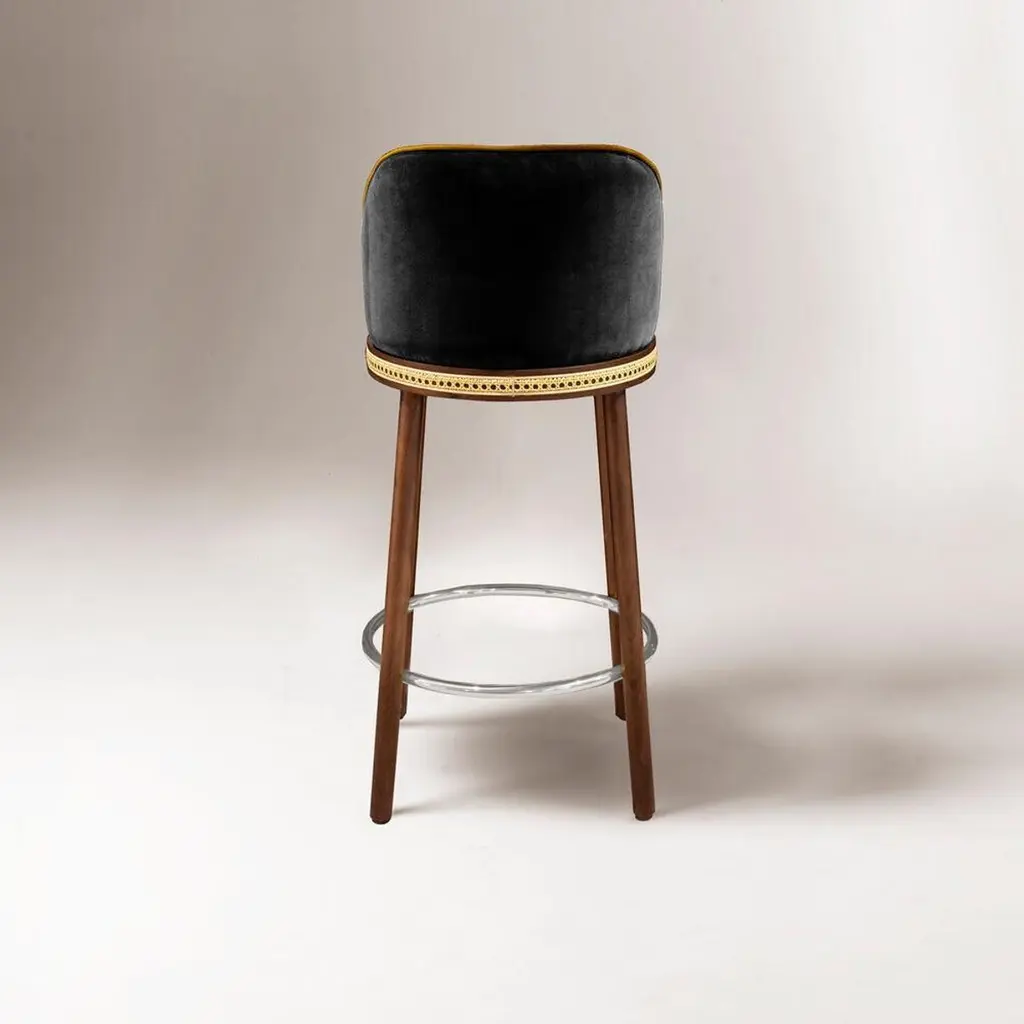 Alma counter & bar stool. As any admirer would experience gazing at its muse, it is impossible not to feel enchanted and almost hypnotized by the refined, sensual lines and the delightfully charming soul of Alma Bar Stool. In a piece that combines classic and modern aesthetics we can find a certain harmonic gracefulness paired with an intimate voluptuousness that can embrace you and surprisingly break the frontiers of sophistication and elegance.MaterialUpholstery: fabric or leatherStructure: solid wood: natural walnut and natural oakRattan: natural rattanFeaturesSeat style: roundSeat back type: sLow backWeight capacity: 400 lb.Footrest included: Yes.
