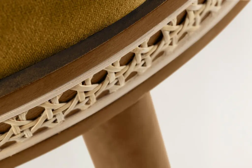 Alma counter & bar stool. As any admirer would experience gazing at its muse, it is impossible not to feel enchanted and almost hypnotized by the refined, sensual lines and the delightfully charming soul of Alma Bar Stool. In a piece that combines classic and modern aesthetics we can find a certain harmonic gracefulness paired with an intimate voluptuousness that can embrace you and surprisingly break the frontiers of sophistication and elegance.MaterialUpholstery: fabric or leatherStructure: solid wood: natural walnut and natural oakRattan: natural rattanFeaturesSeat style: roundSeat back type: sLow backWeight capacity: 400 lb.Footrest included: Yes.