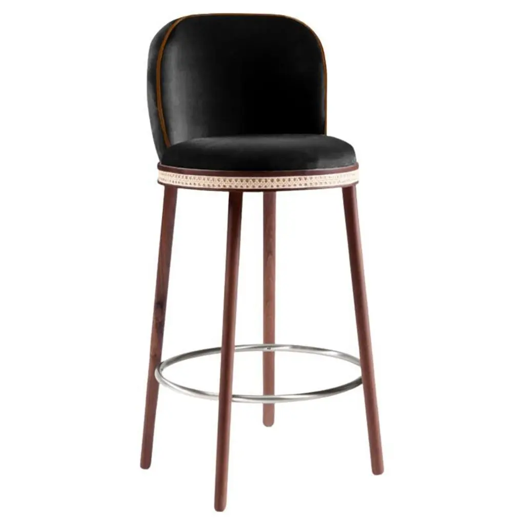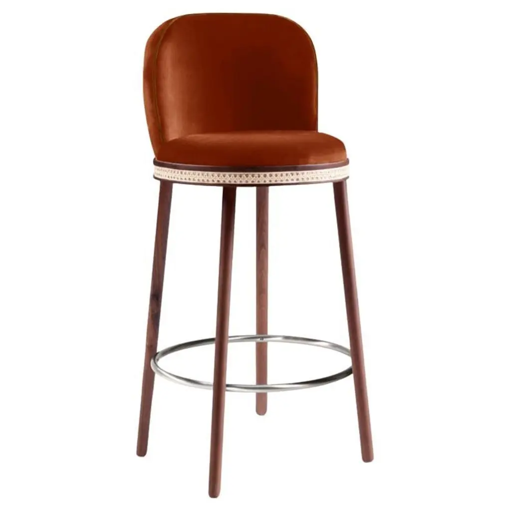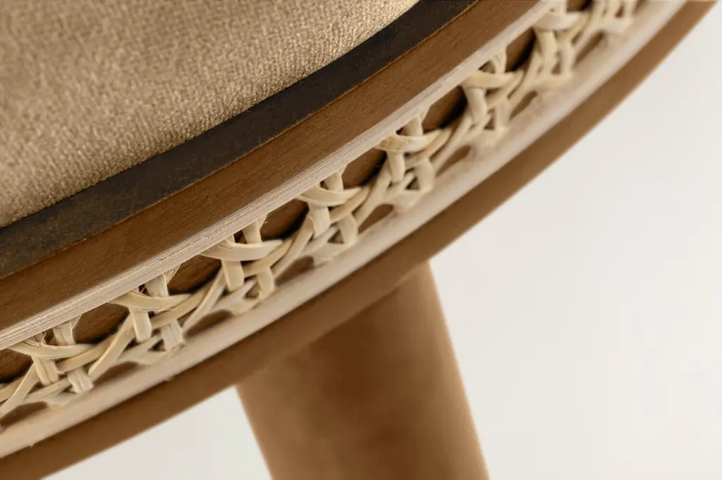 Alma counter & bar stool. As any admirer would experience gazing at its muse, it is impossible not to feel enchanted and almost hypnotized by the refined, sensual lines and the delightfully charming soul of Alma Bar Stool. In a piece that combines classic and modern aesthetics we can find a certain harmonic gracefulness paired with an intimate voluptuousness that can embrace you and surprisingly break the frontiers of sophistication and elegance.MaterialUpholstery: fabric or leatherStructure: solid wood: natural walnut and natural oakRattan: natural rattanFeaturesSeat style: roundSeat back type: sLow backWeight capacity: 400 lb.Footrest included: Yes.