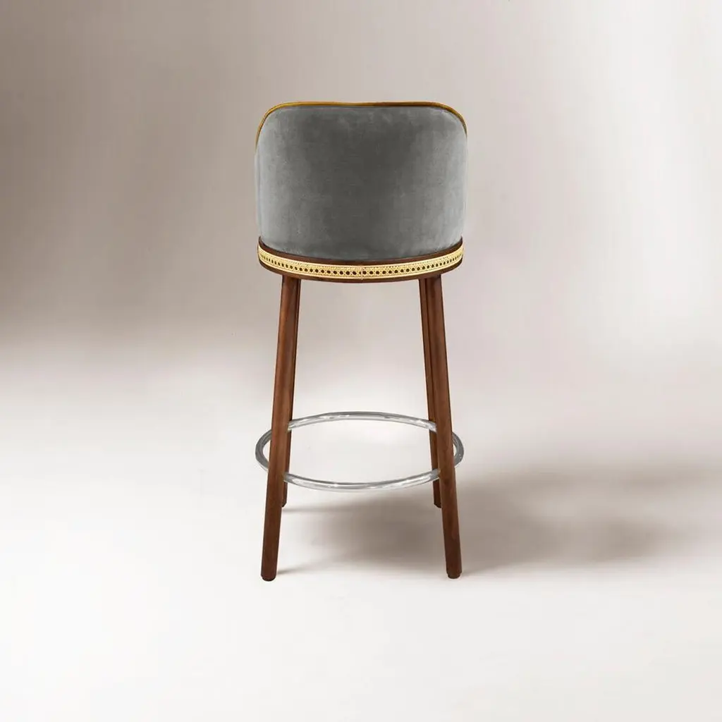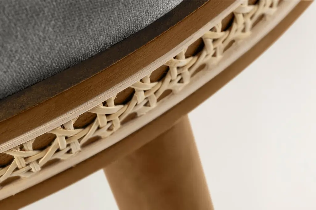 Alma counter & bar stool. As any admirer would experience gazing at its muse, it is impossible not to feel enchanted and almost hypnotized by the refined, sensual lines and the delightfully charming soul of Alma Bar Stool. In a piece that combines classic and modern aesthetics we can find a certain harmonic gracefulness paired with an intimate voluptuousness that can embrace you and surprisingly break the frontiers of sophistication and elegance.MaterialUpholstery: fabric or leatherStructure: solid wood: natural walnut and natural oakRattan: natural rattanFeaturesSeat style: roundSeat back type: sLow backWeight capacity: 400 lb.Footrest included: Yes.