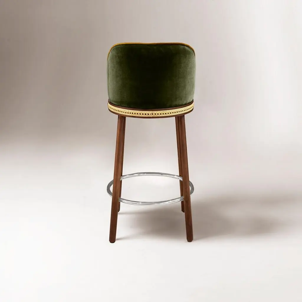 Alma counter & bar stool. As any admirer would experience gazing at its muse, it is impossible not to feel enchanted and almost hypnotized by the refined, sensual lines and the delightfully charming soul of Alma Bar Stool. In a piece that combines classic and modern aesthetics we can find a certain harmonic gracefulness paired with an intimate voluptuousness that can embrace you and surprisingly break the frontiers of sophistication and elegance.MaterialUpholstery: fabric or leatherStructure: solid wood: natural walnut and natural oakRattan: natural rattanFeaturesSeat style: roundSeat back type: sLow backWeight capacity: 400 lb.Footrest included: Yes.
